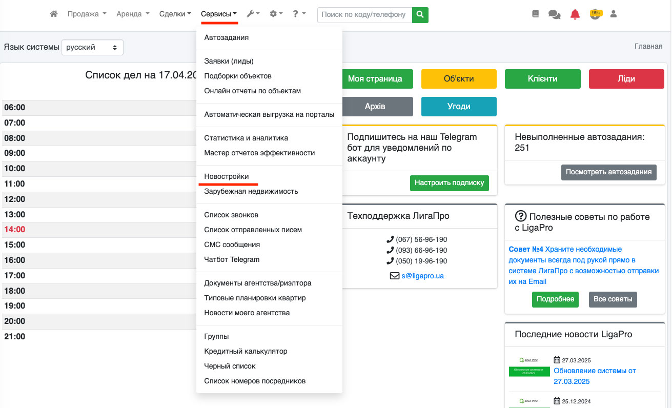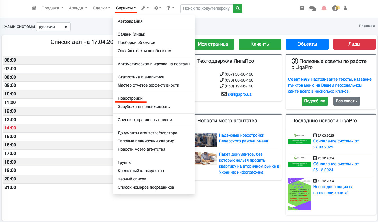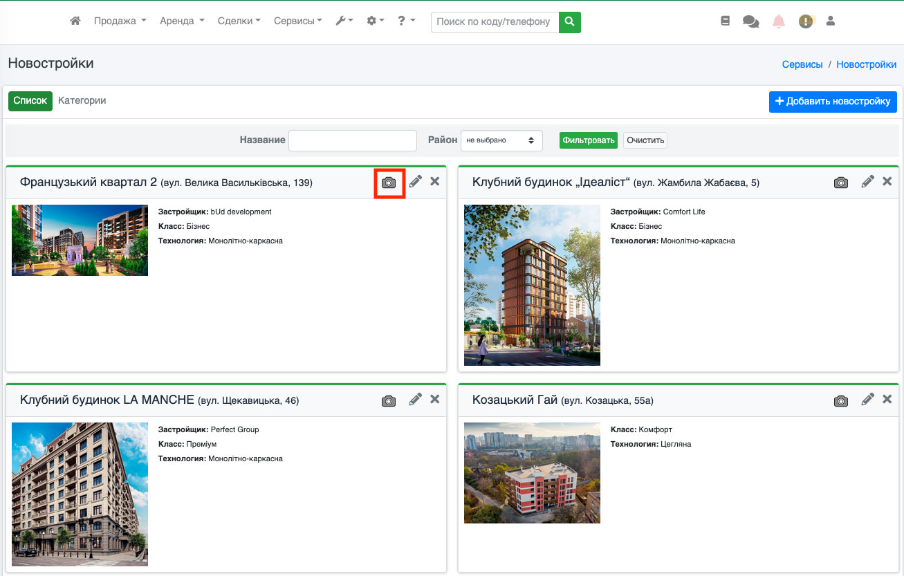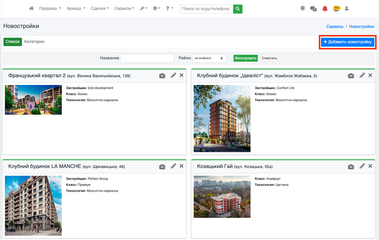 Щоб створити каталог новобудов, необхідно зайти в пункт «Сервіси-Новобудови» і додати потрібні ЖК (Рис. 1269).