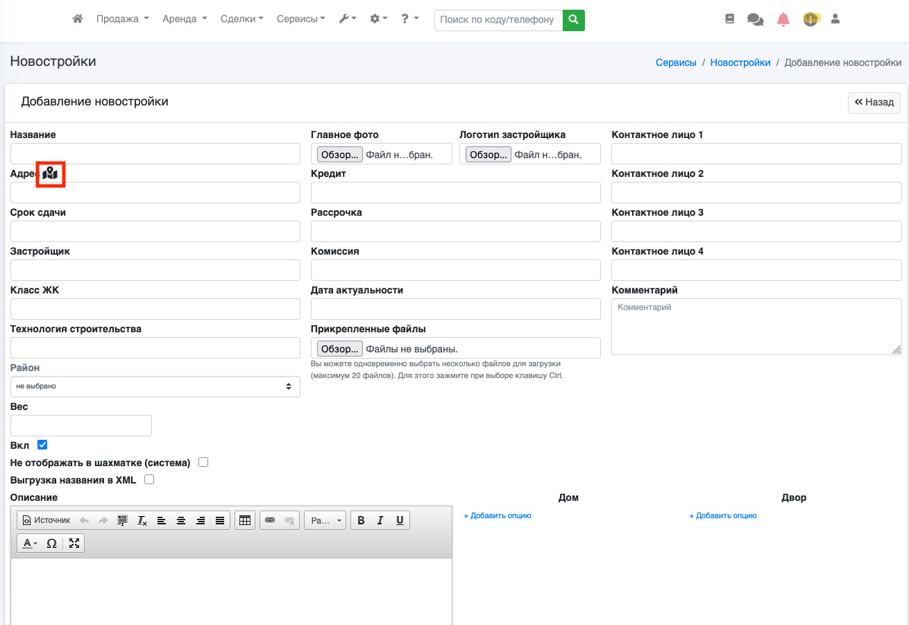 Після того, як Ви створили каталог новобудов і в системі і на зовнішньому сайті, Ви можете до конкретного ЖК прив'язати об'єкт, який знаходиться у Вашій базі (тільки з рубрики продаж квартир). Для цього перейдіть в редагування об'єкту (Рис. 1298, Рис. 1299).