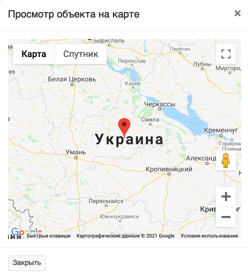 - Звідки - тут Ви можете вказати адресу новобудови. Також додатково можна відзначити точну адресу на карті - натисніть на іконку карти (Рис. 1272) і у Вас відкриється діалогове вікно, в якому можна поставити маркер в точку розташування об'єкта (Рис. 1271).