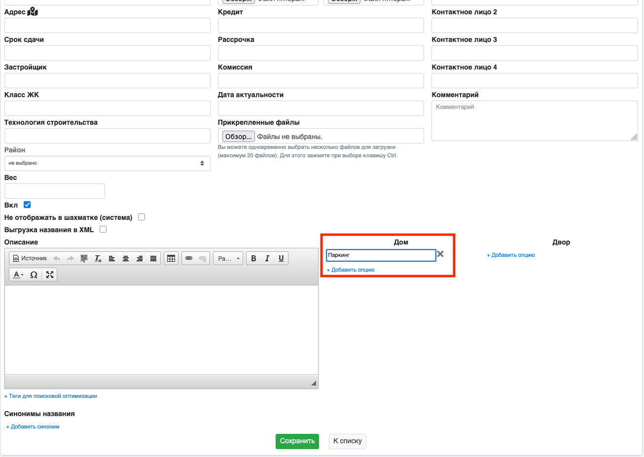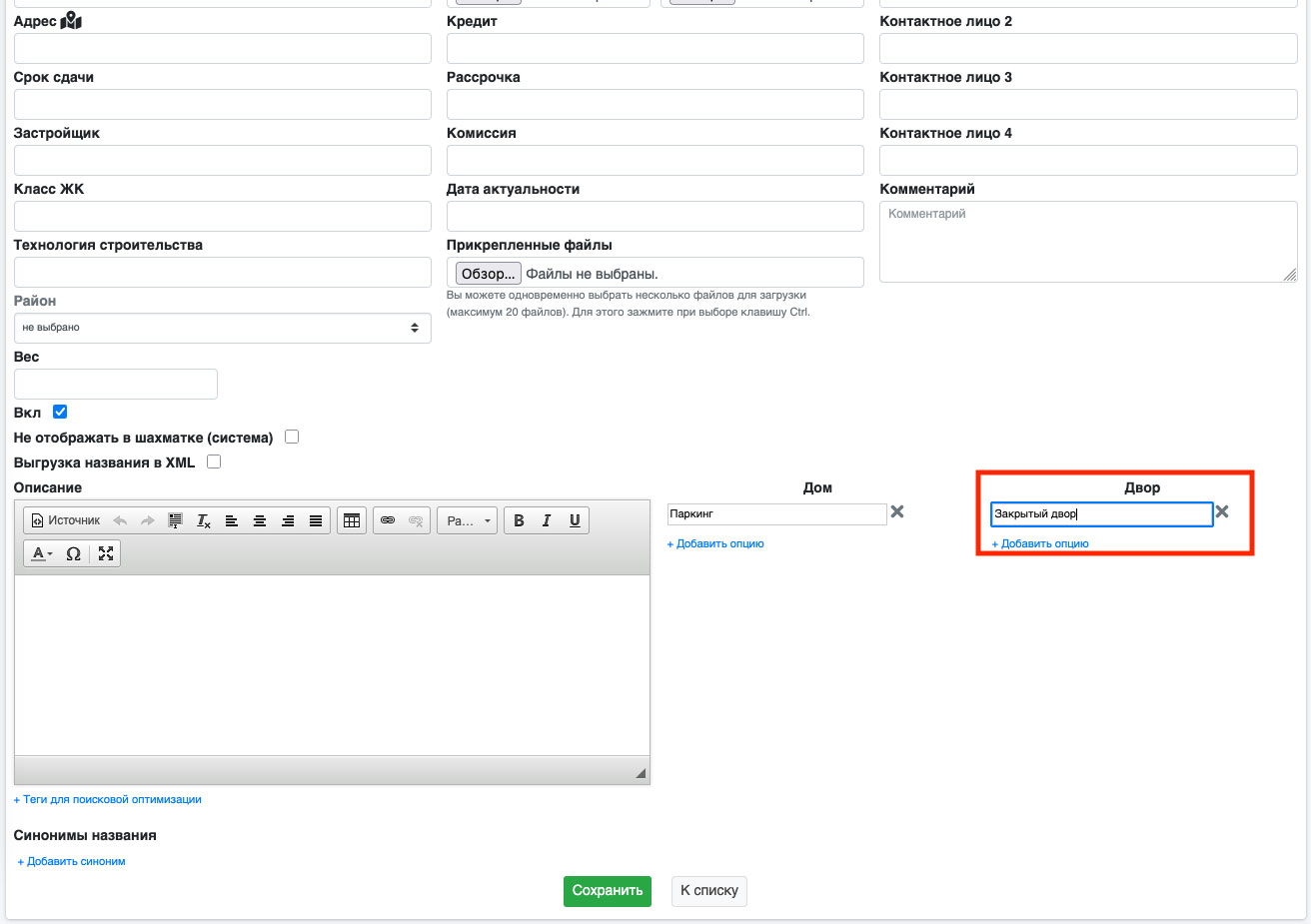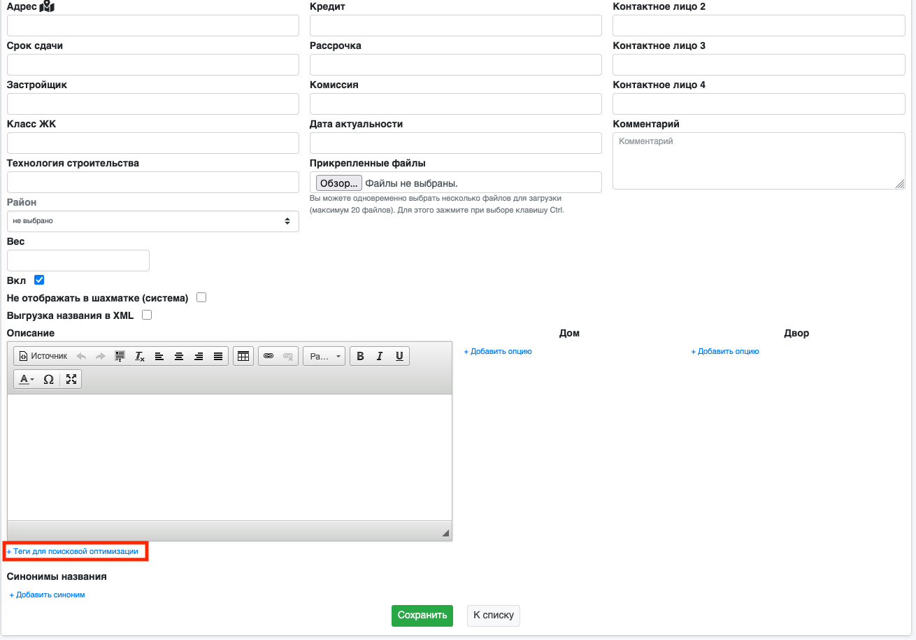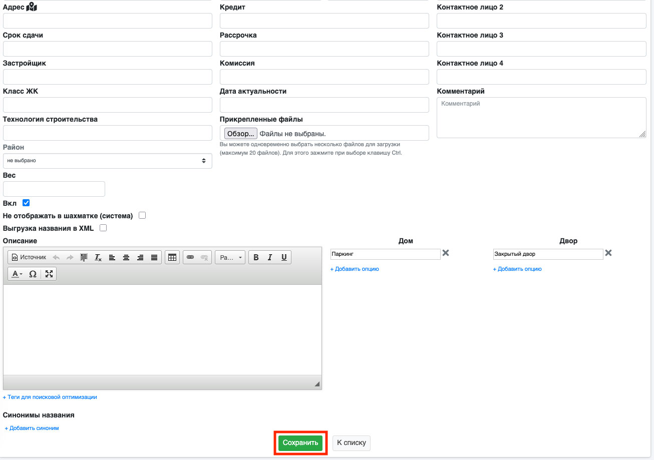 - Увімкнути - якщо з якоїсь причини потрібно видалити ЖК з каталогу на Вашому сайті, просто зніміть галочку з цього пункту. Усередині CRM ЖК буде, а на зовнішньому сайті не буде доступний для перегляду.