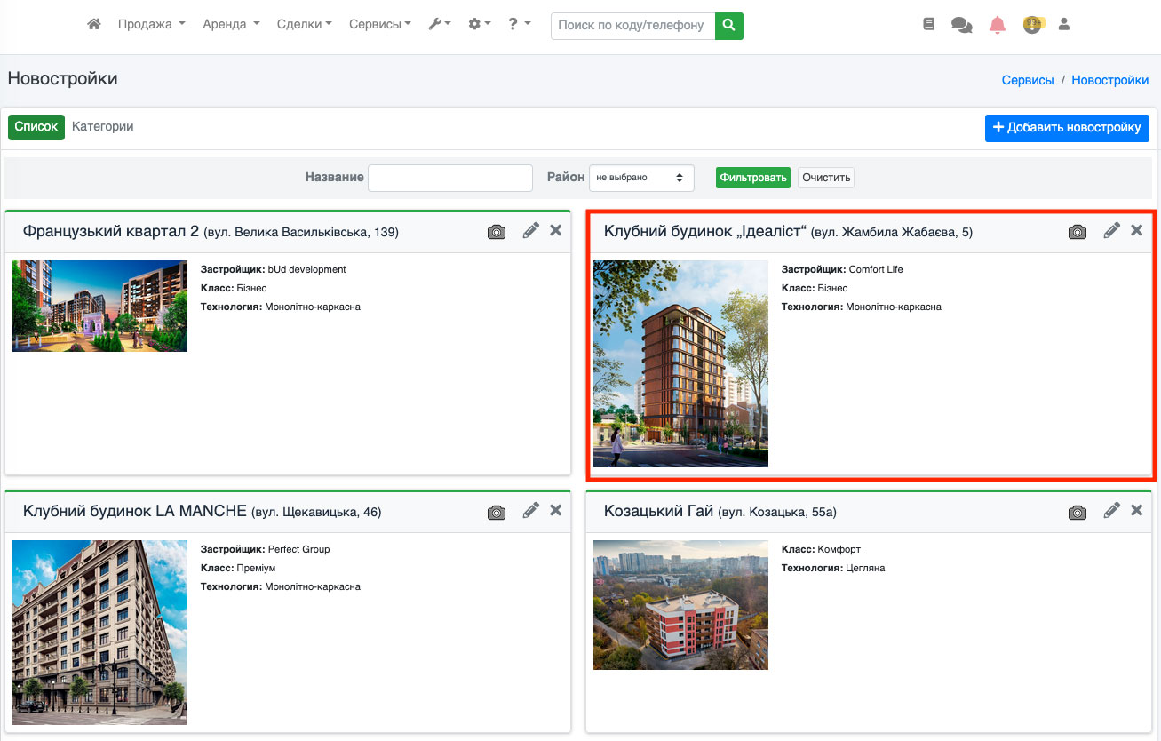 Також, після додавання категорій у Вас з'явиться можливість фільтрувати новобудови за категоріями. Додатково існує можливість пошуку по тексту (назва ЖК) (Рис. 1293). Це дозволить всередині CRM швидко знаходити потрібний ЖК для роботи з ним.
