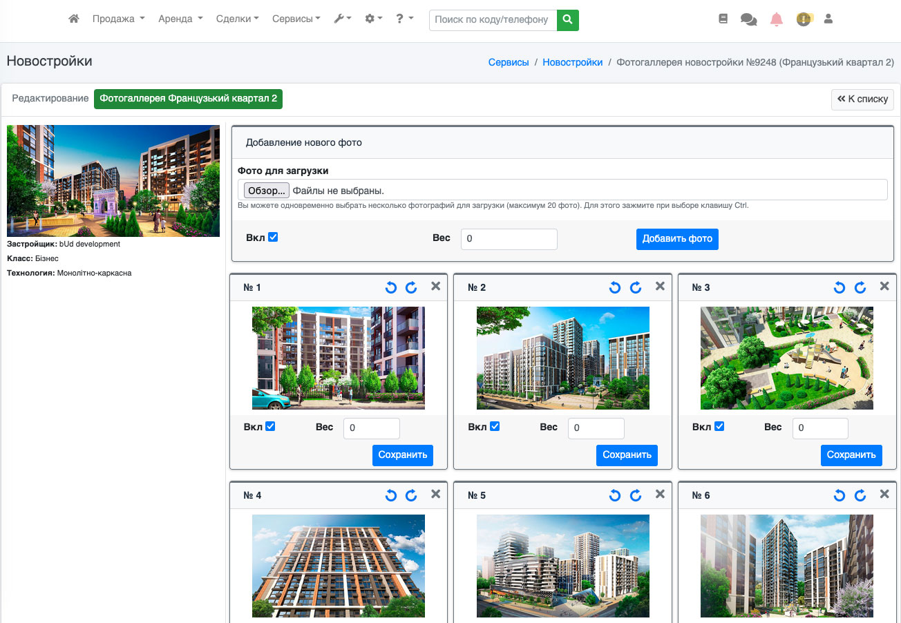- Вага - призначений для сортування ЖК в каталозі. Наприклад, якщо Ви хочете, щоб той чи інший ЖК був вище в списку - просто поставте в цьому ЖК вагу (для цього використовуються числа, наприклад 5, 100, 450). Чим вище число - тим вище ЖК в списку на Вашому сайті.