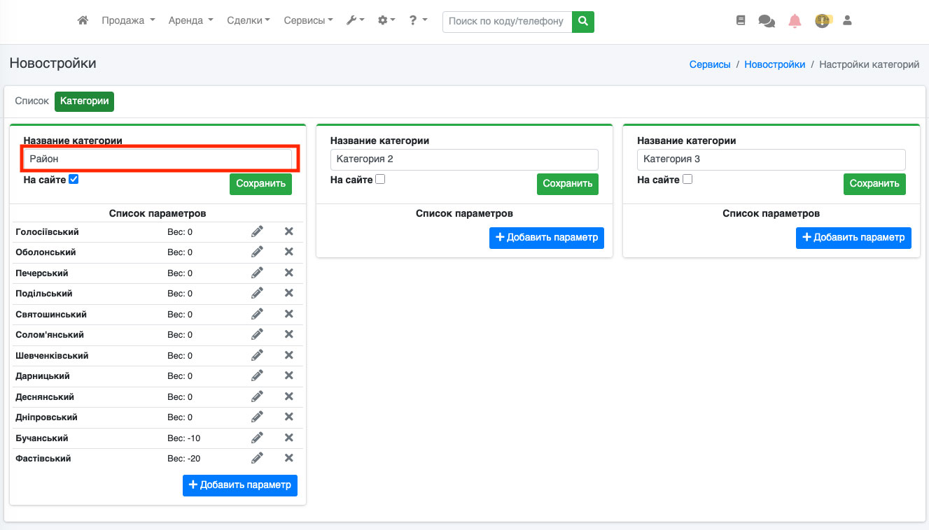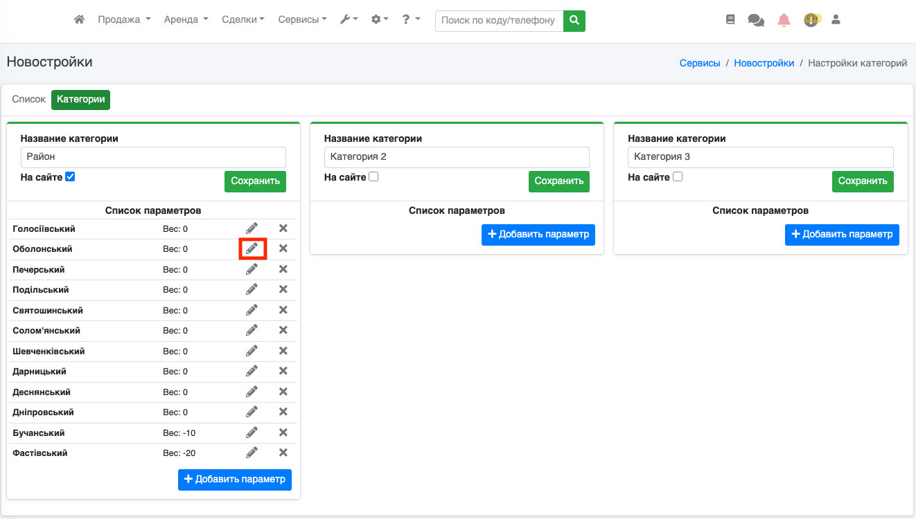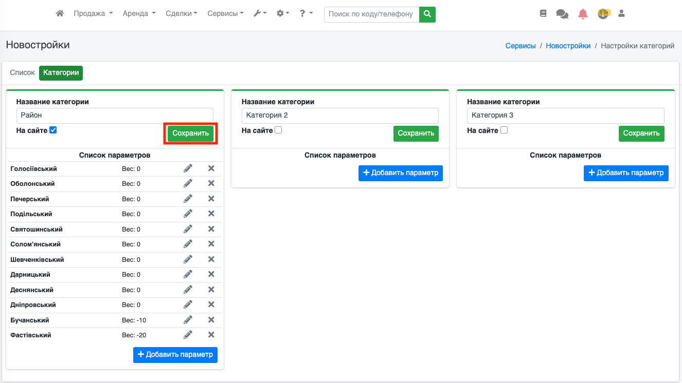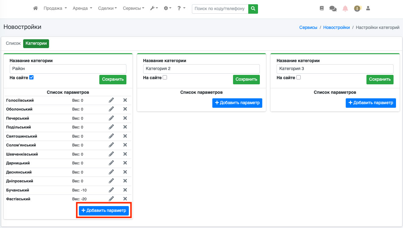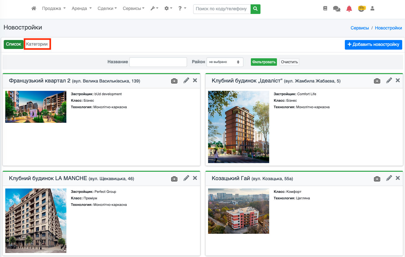 Щоб Ваші клієнти і Ви могли орієнтуватися у великих каталогах ЖК - ми передбачили можливість створення «Категорій». Категорії налаштовуються під різні потреби фільтра. Щоб налаштувати категорії - просто перейдіть в пункт «Сервіси- Новобудови» (Рис. 1280).