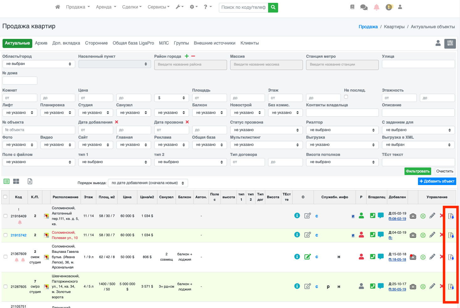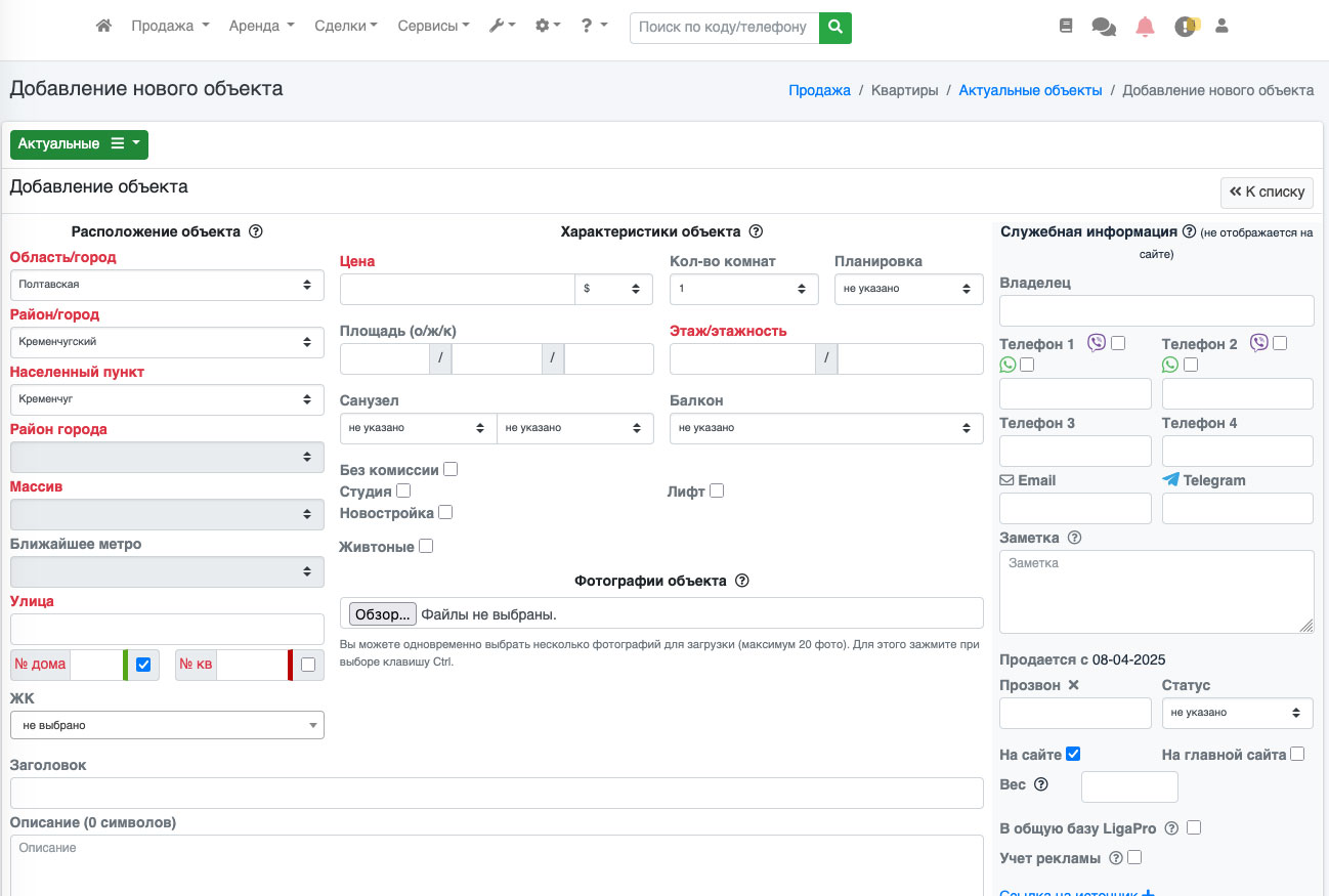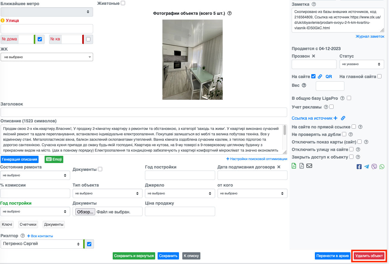 4.Служебная информация – контакты владельца (дополнительно можно отметить наличие телефона в мессенджерах, чтобы потом быстро переходить в чат с владельцем), заметка по объекту (есть опция хранения истории всех заметок). Также вы указываете такую информацию, как: объект без комиссии, дата последнего прозвона, контакты владельца, размещать объект на сайте или нет, разместить объект на главной странице сайта, разместить в общей базе LigaPro, ссылка на источник (ссылка на другой сайт), на сайте по прямой ссылке, отключить показ карты, отключить улицу на сайте, закрыть объект.
