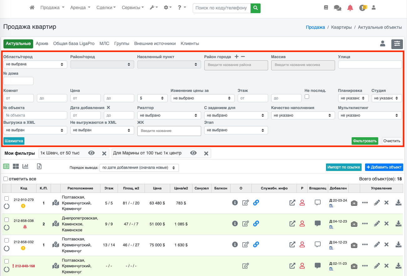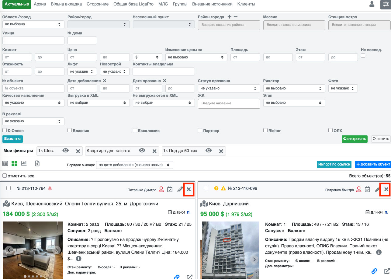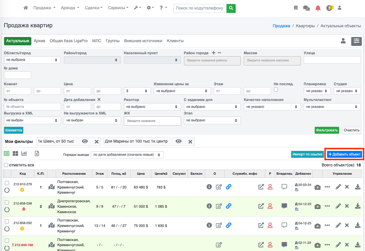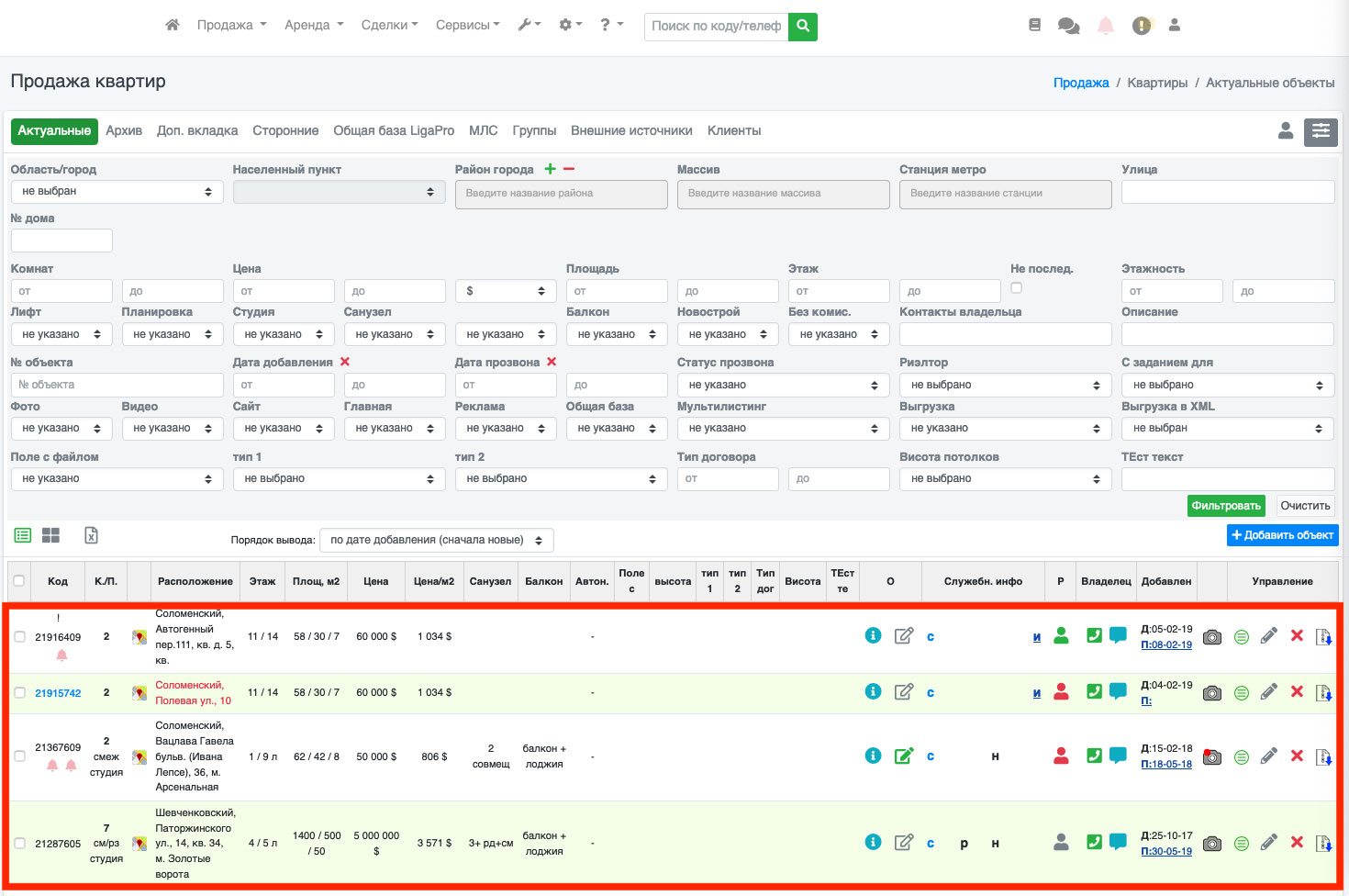 4.Служебная информация – контакты владельца (дополнительно можно отметить наличие телефона в мессенджерах, чтобы потом быстро переходить в чат с владельцем), заметка по объекту (есть опция хранения истории всех заметок). Также вы указываете такую информацию, как: объект без комиссии, дата последнего прозвона, контакты владельца, размещать объект на сайте или нет, разместить объект на главной странице сайта, разместить в общей базе LigaPro, ссылка на источник (ссылка на другой сайт), на сайте по прямой ссылке, отключить показ карты, отключить улицу на сайте, закрыть объект.