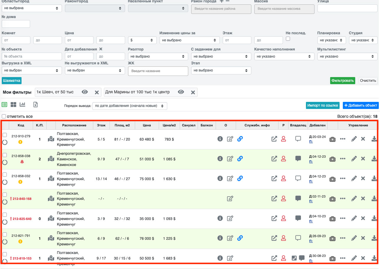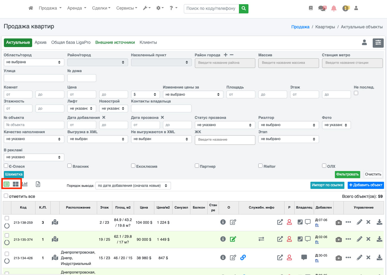 Список объектов недвижимости выводится в виде таблицы (Рис. 102) или в виде блоков (Рис. 103). Для удобства работы некоторые поля выводятся в виде пиктограмм.