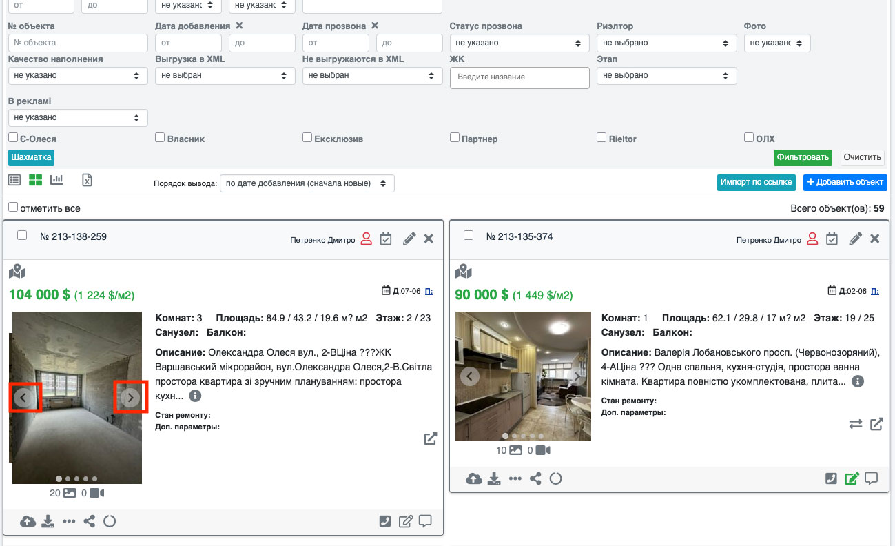 При просмотре плиткой существует возможность быстрого просмотра фото: Вам не нужно отдельно заходить в фотогалерею, достаточно просто пролистать фото на странице отображения списка объектов (Рис. 105).