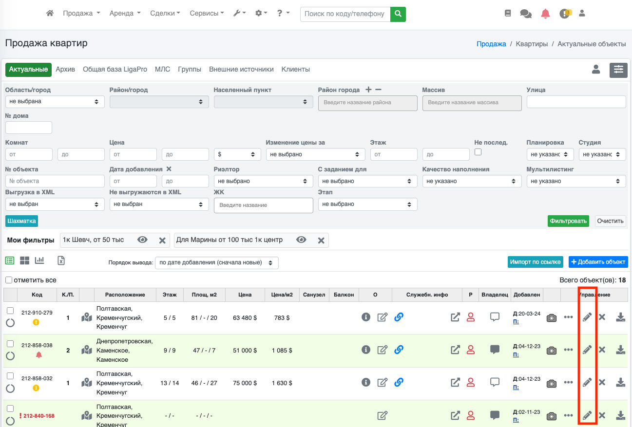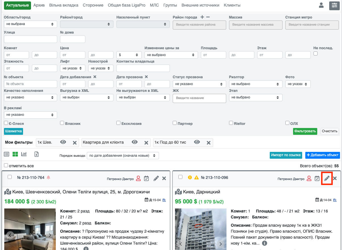 Для редактирования объекта в базе нужно нажать на иконку «Карандаш» (Рис. 94, Рис. 95). После чего Вы попадете в карточку объекта. Редактирование производится аналогично добавлению объекта (Рис. 96).