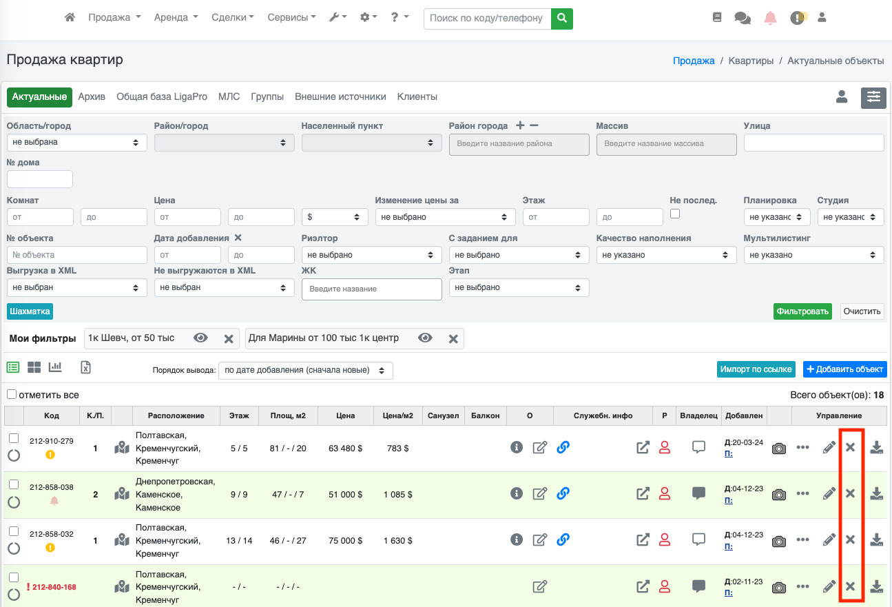 Для удаления объекта в базе нужно нажать на иконку «крестик» (Рис. 97, Рис. 98).