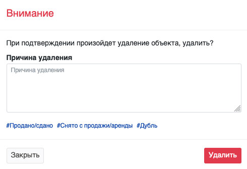 После чего у Вас появится диалоговое окно с подтверждением удаления. При желании Вы можете указать причину удаления или воспользоваться быстрыми хэштегами (Рис. 99).
