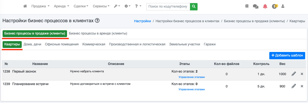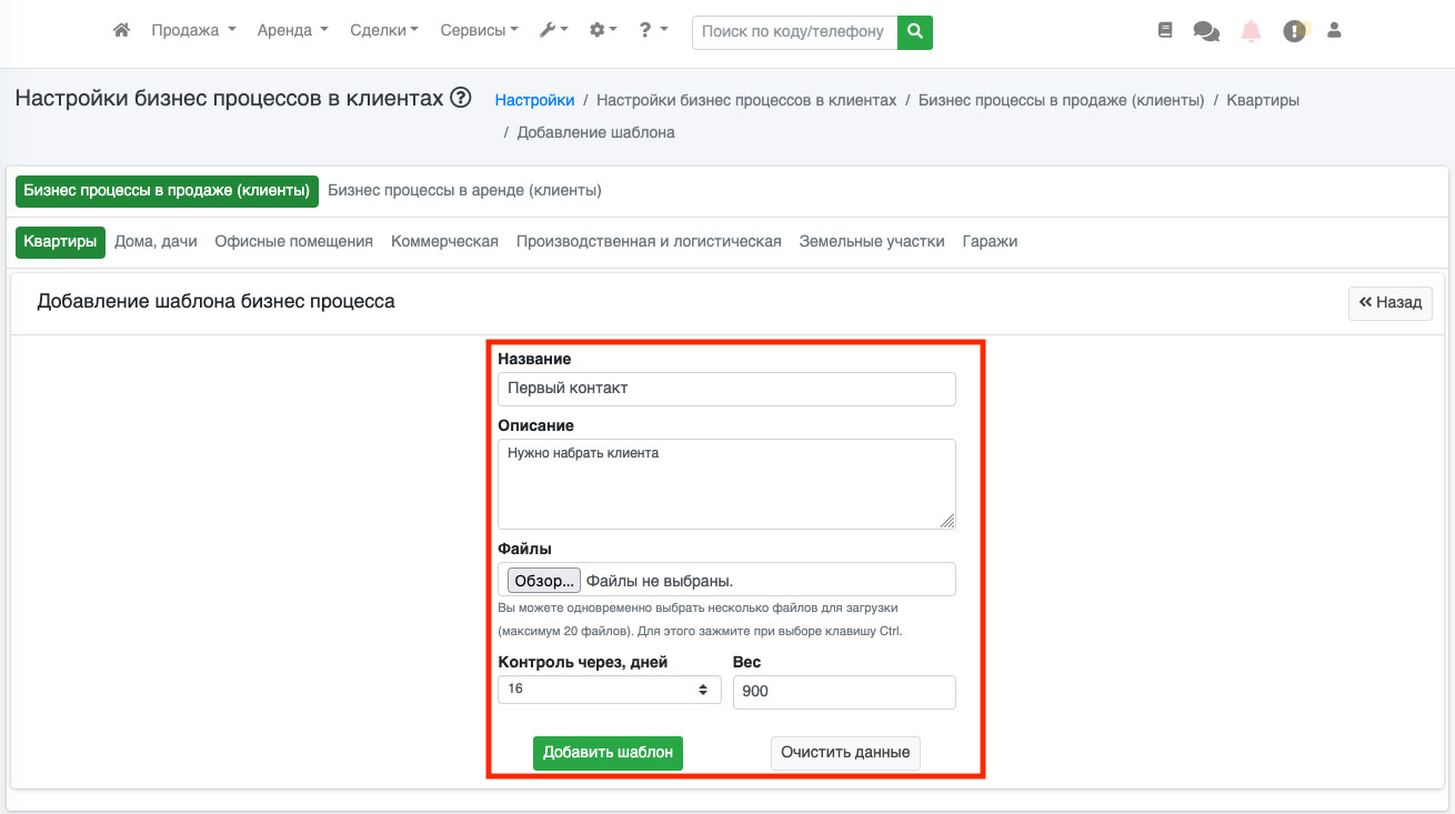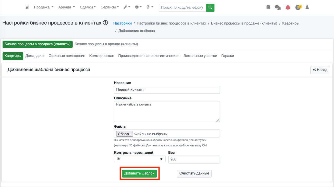 - Контроль через, дней – эта функция позволяет мониторить ход выполнения этапа. Например, если на этот этап достаточно 2 дня - Вы можете указать здесь 2 дня и система зафиксирует эту информацию для контроля выполнения этого этапа в срок риэлтором/пользователем.
