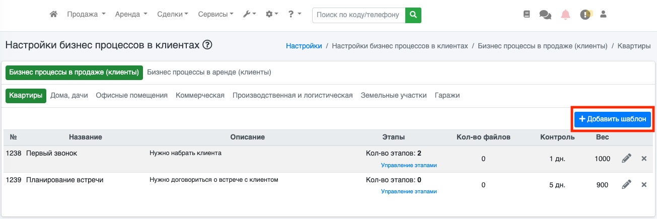 Теперь необходимо создать шаблоны/этапы воронки. Для этого необходимо нажать кнопку «Добавить шаблон»(Рис. 1343)
