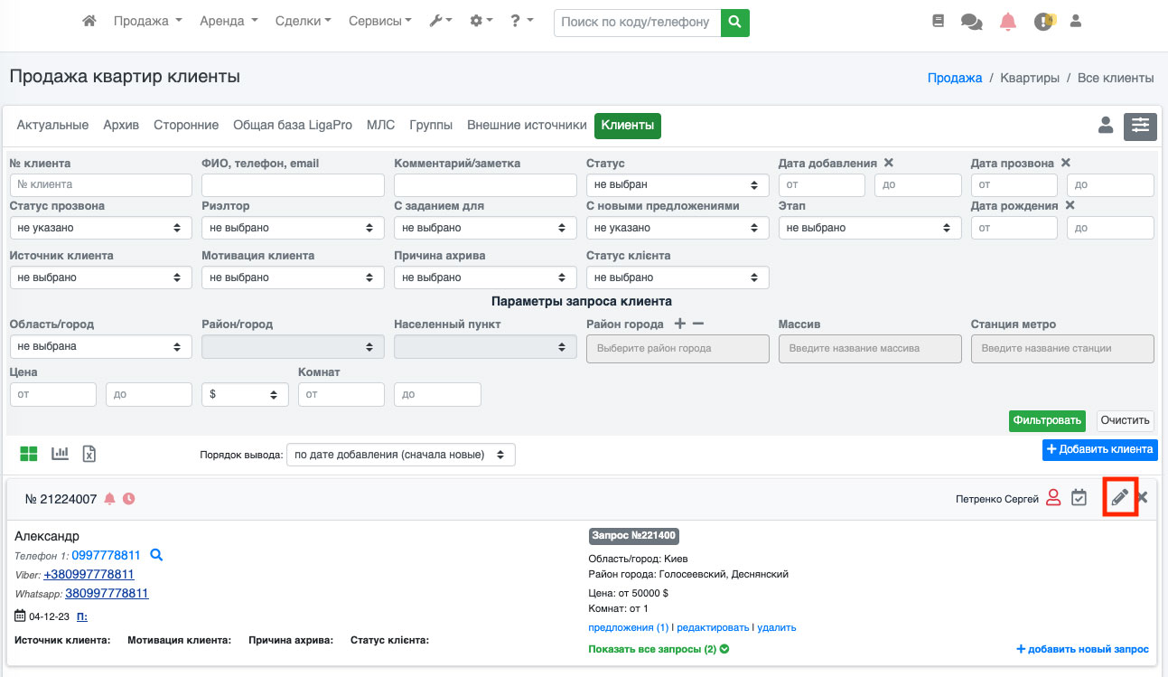 После того, как Вы все настроили, если хоть для одного этапа Вы указали количество дней для контроля, система автоматически при добавлении нового клиента будет активировать созданую Вами воронку продаж. Если не указан контроль, то воронку продаж нужно будет активировать вручную, точно также для всех уже существующиъ клиентов воронку продаж нужно активировать вручную. Чтобы активировать воронку продаж, перейдите в редактирование клиента (Рис. 1347).