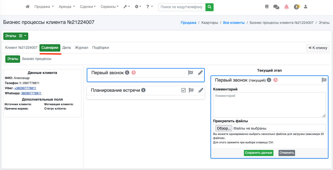 После этого перейдите на вкладку «Сценарии» (Рис. 1348). И здесь уже можно вручную активировать первый этап воронки продаж (Рис. 1349)