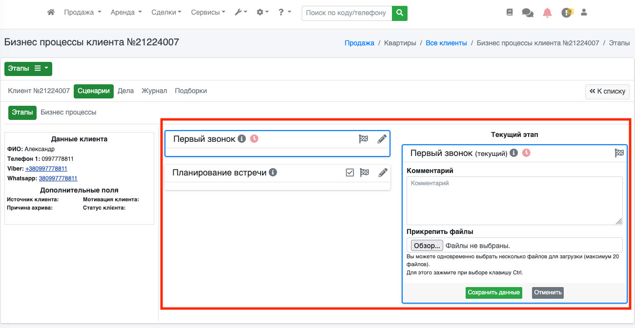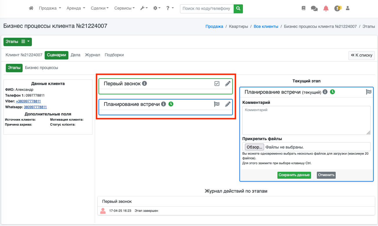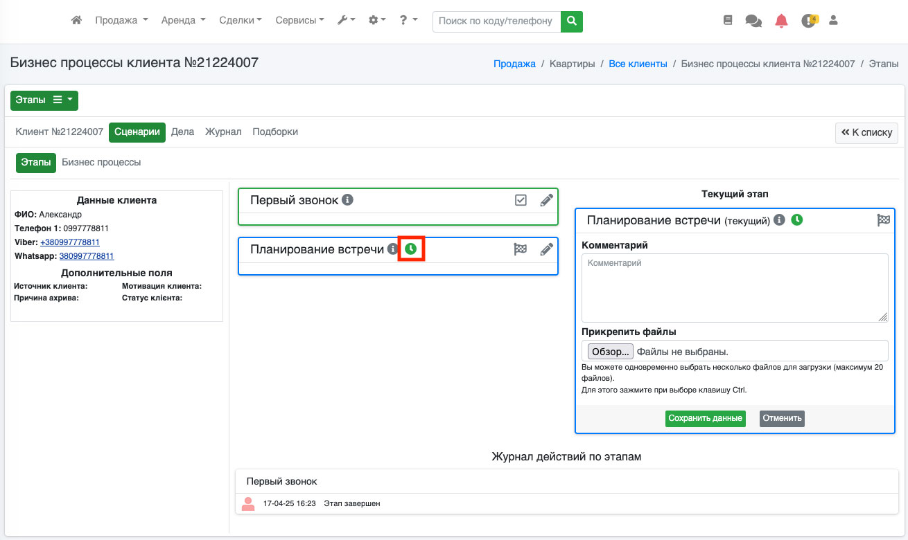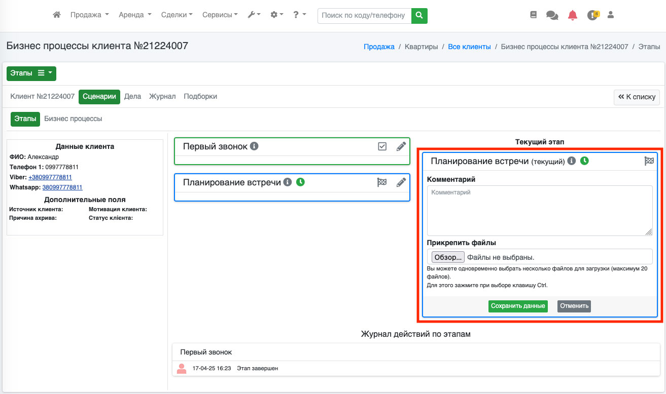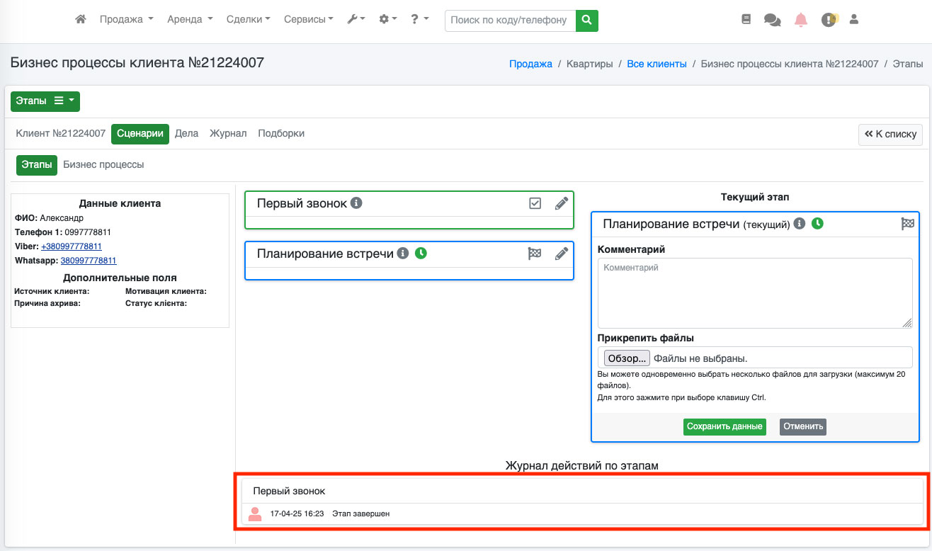 Чтобы быть в курсе всех событий по работе с клиентом, существует журнал действий по этапам, где фиксируются все события: редактирование этапа, прикрепление файла, изменение статуса этапа. Вы всегда будете в курсе что и когда делал риэлтор и ничего не упустите (Рис. 1359).
