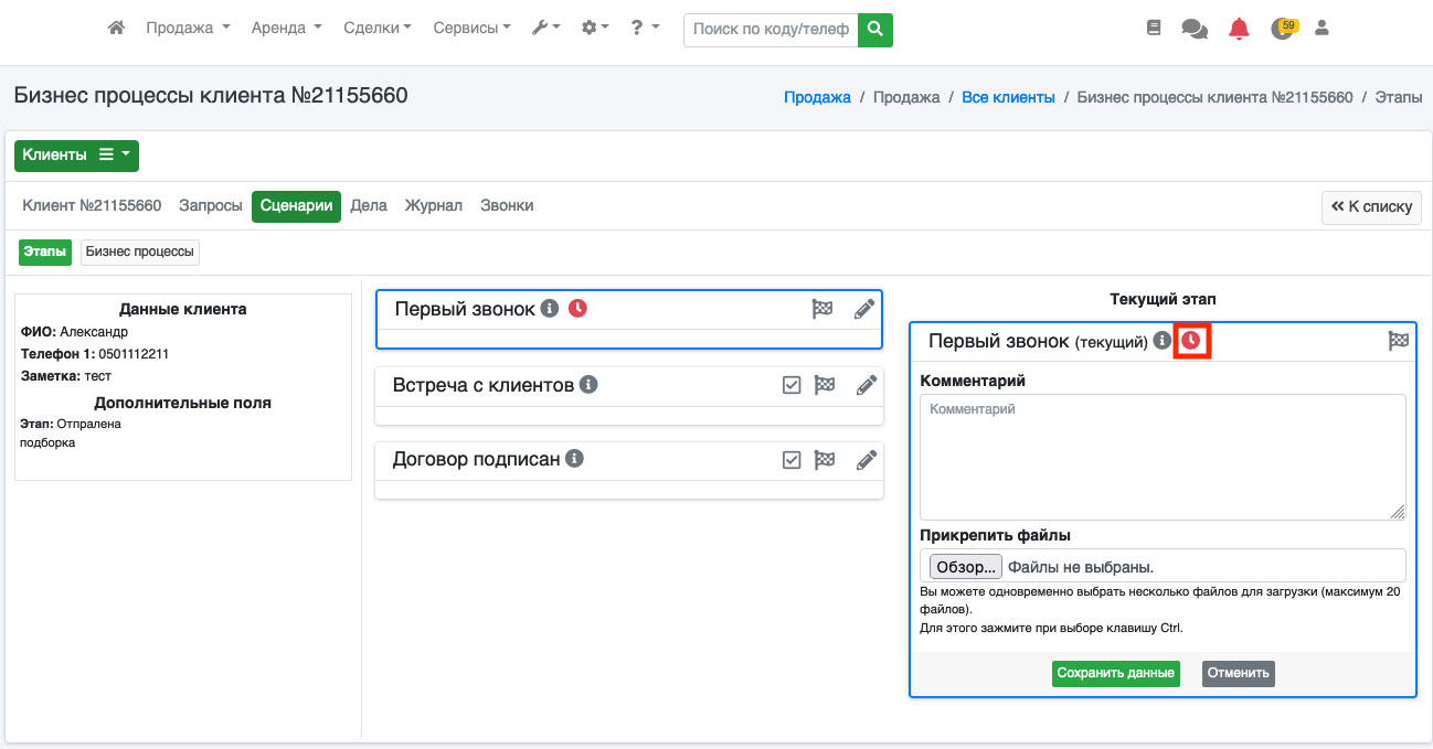 Чтобы сделать этап «основным» (тем, на котором сейчас клиент) нужно просто нажать на иконку «Чекбокс с галочкой» (Рис. 1351).