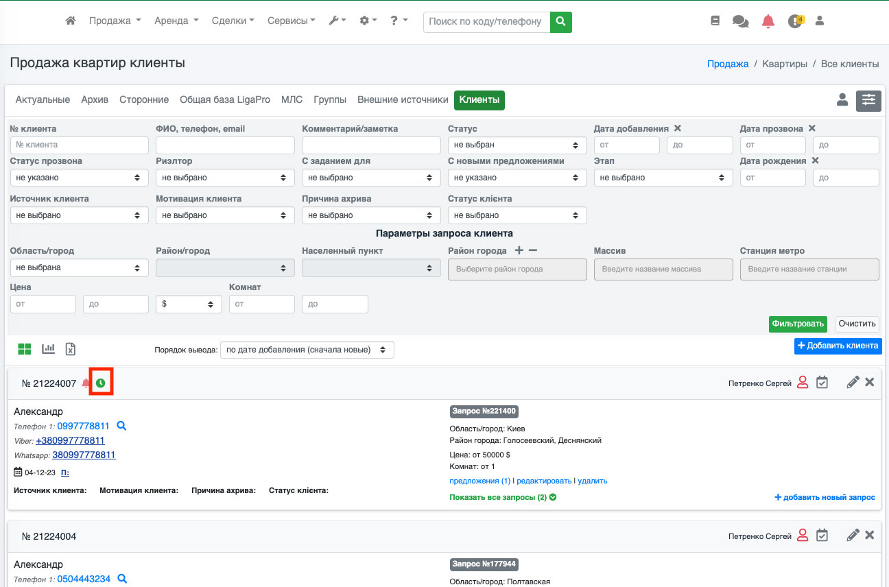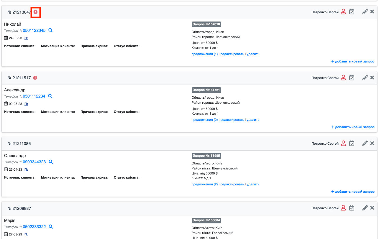 Точно такие же часы для удобства высвечиваются в каждом клиенте в списке, поэтому даже не заходя в карточку клиента можно понять, просрочено выполнение этапа или нет (Рис. 1355,1356).