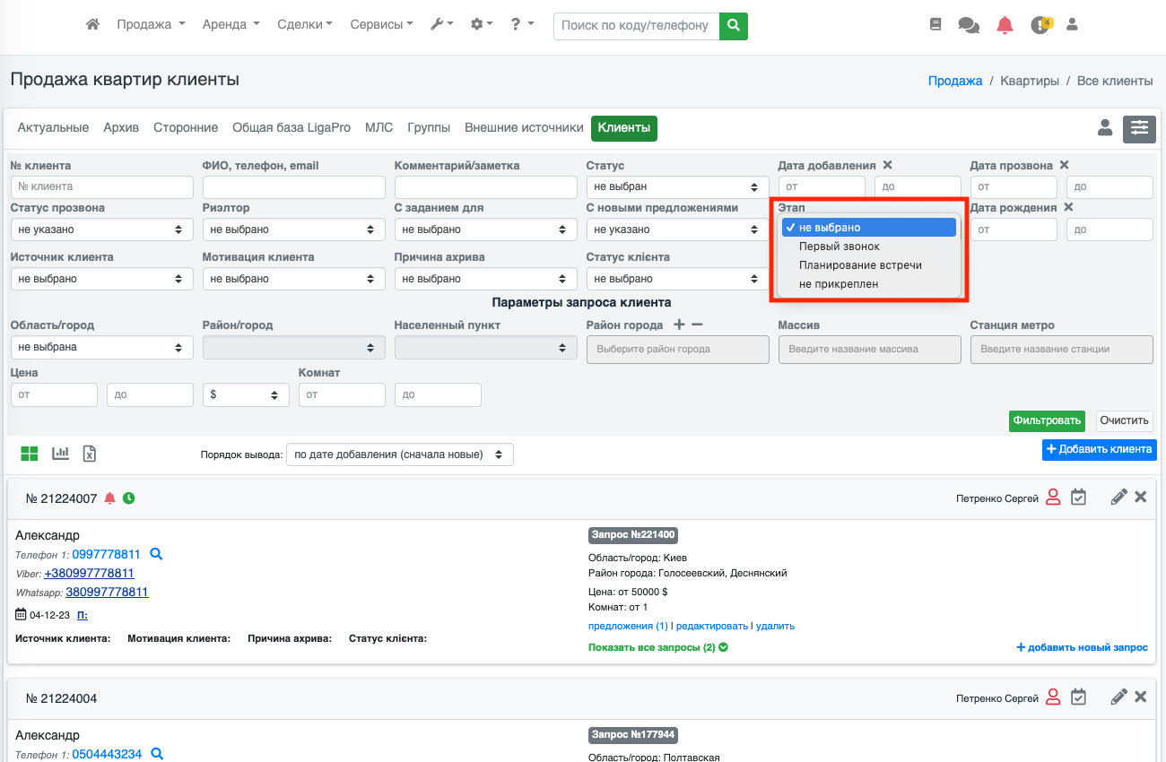 Также в списке клиентов Вы можете фильтровать по этапу, на котором они находятся (Рис. 1357). Это позволит риэлтору/администратору посмотреть, на каком этапе находится те или иные клиенты в один клик и быстро контролировать движение клиентов по воронке продаж.