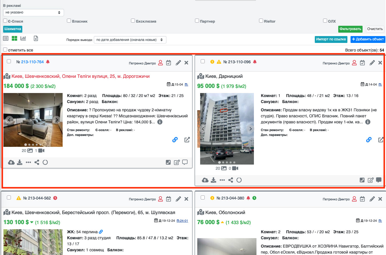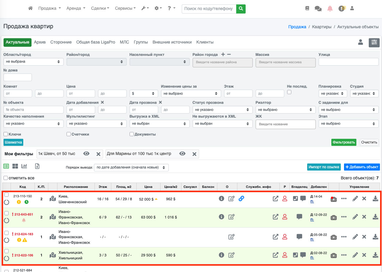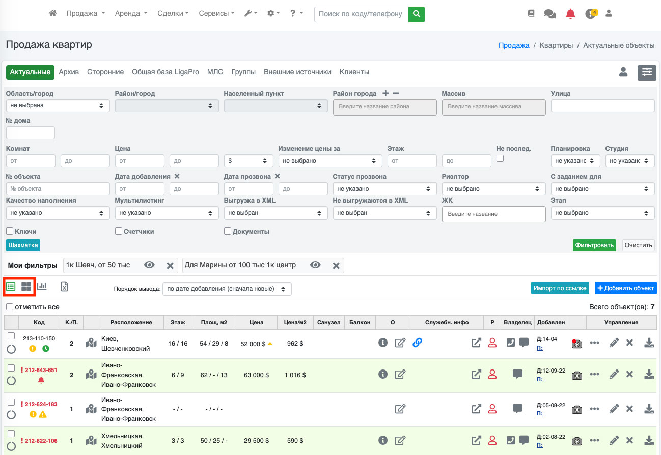 Важно! При входе в систему с мобильного устройства объекты по умолчанию будут отображаться в виде блоков, а кнопки переключения в табличный вид не будет. Это сделано с учетом того, что в табличном формате просматривать объекты с мобильного устройства просто не очень удобно. Если по какой то причине Вы все же хотите просматривать на мобильном устройсвте объекты в виде таблицы, то Вам сначала нужно зайти в систему с компьютера/ноутбука, переключиться на табличный вид, а потом уже авторизироваться на телефоне. Тогда объекты и на телефоне будут отображаться в табличном виде (это будет не совсем удобно, поэтому мы все же рекомендуем просматривать объекты на телефоне в виде блоков).