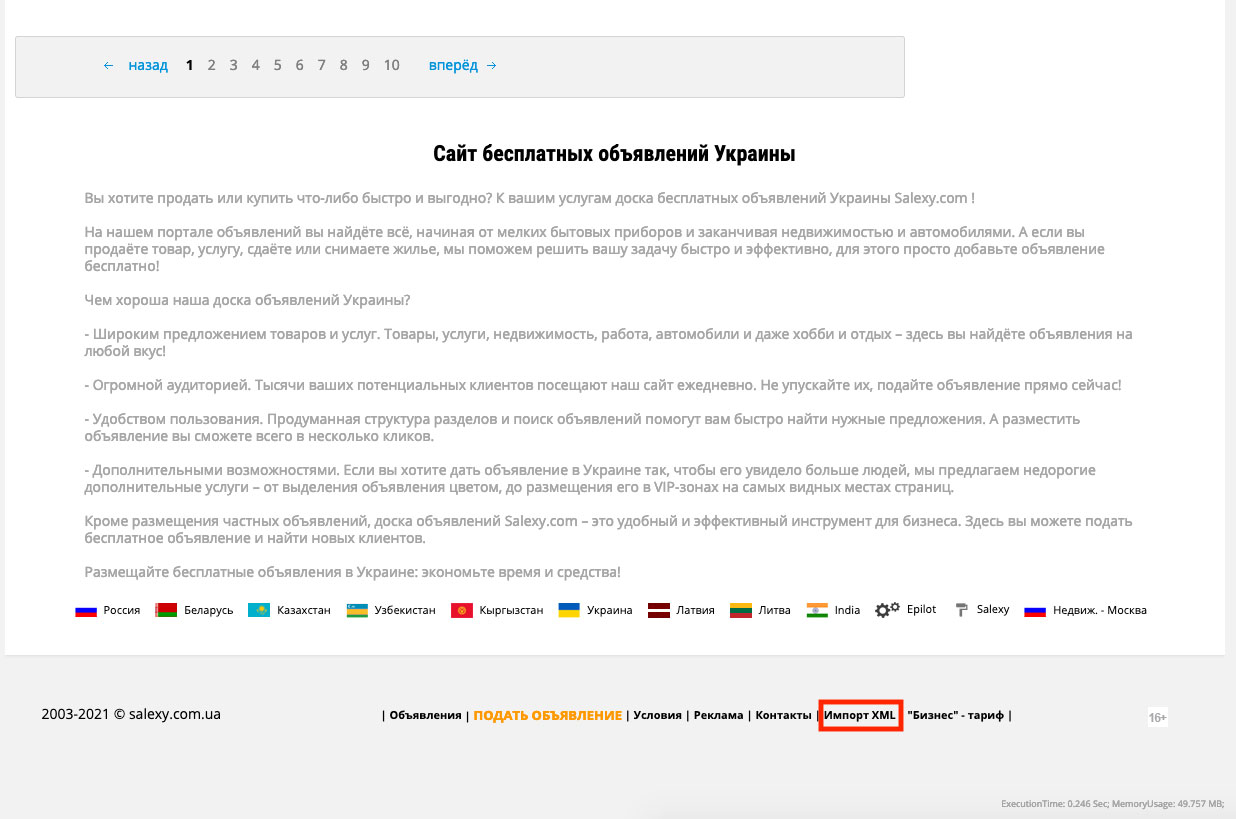 - На сайте salexy.com.ua опуститься в самый низ и найти ссылку «Импорт XML» (Рис. 1364)