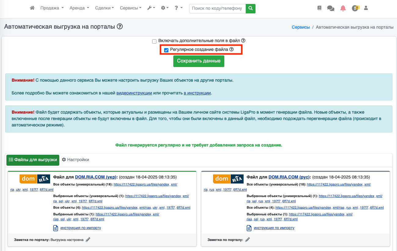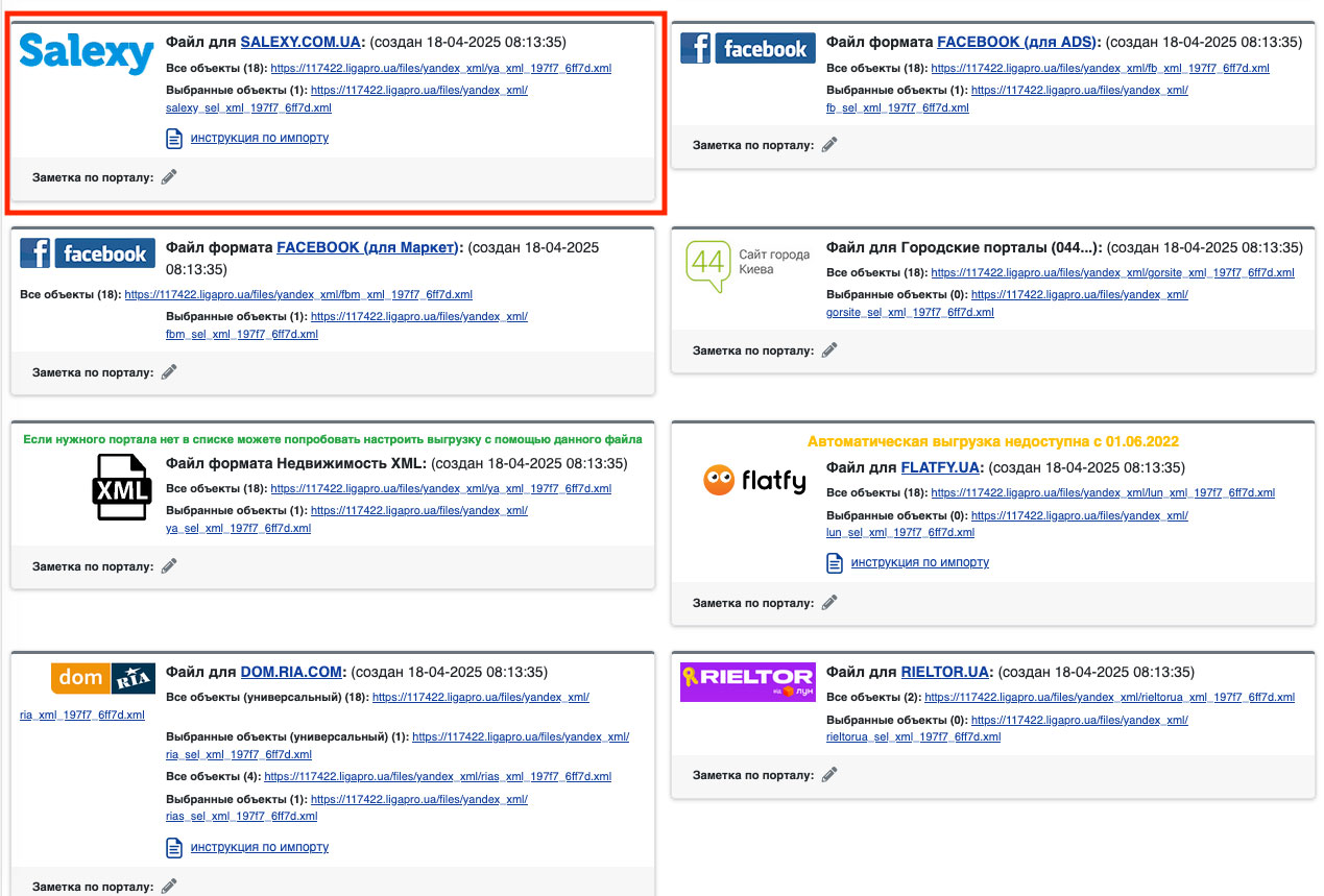 В системе ЛигаПро существует возможность автоматической выгрузки объектов на портал salexy.com.ua.