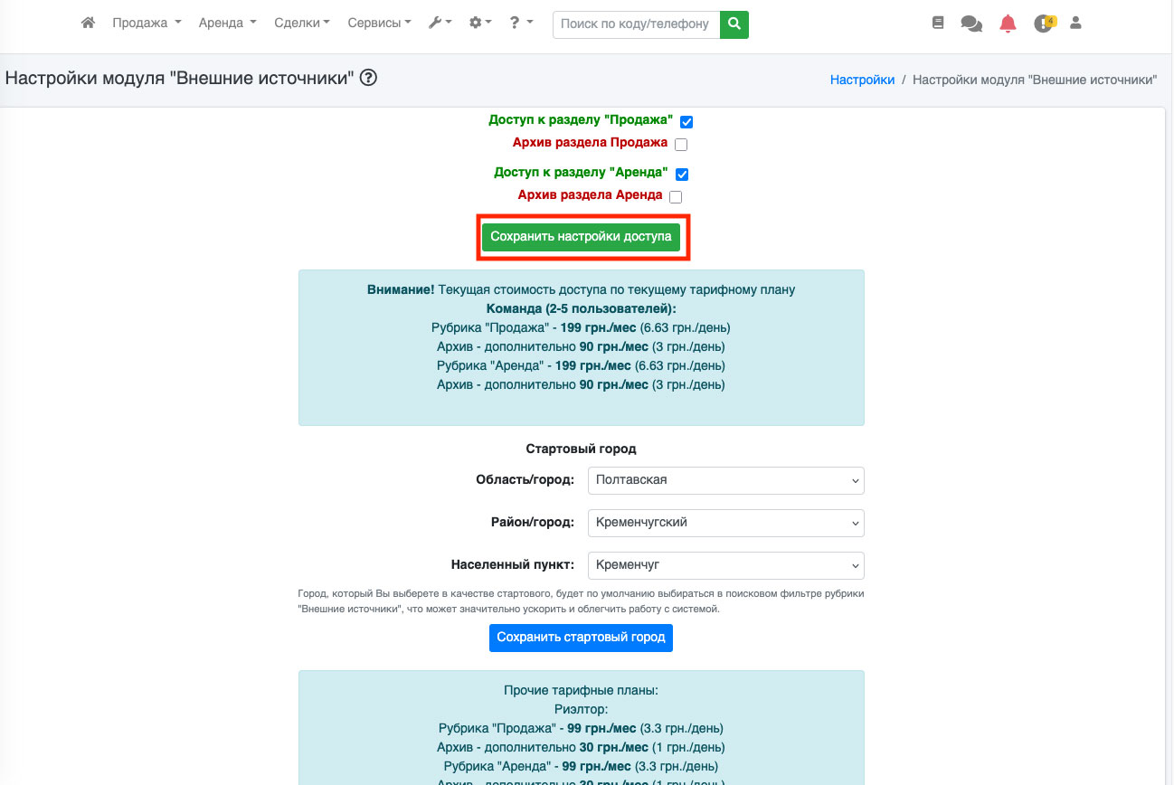 На открывшейся странице Вы можете выбрать для какого раздела активировать модуль: продажа или аренда. Вы можете ознакомиться со стоимостью мость модуля для Вашего аккаунта Рис. 1373). После того, как Вы отметили нужный раздел галочкой, нажать на кнопку «Сохранить настройки доступа».