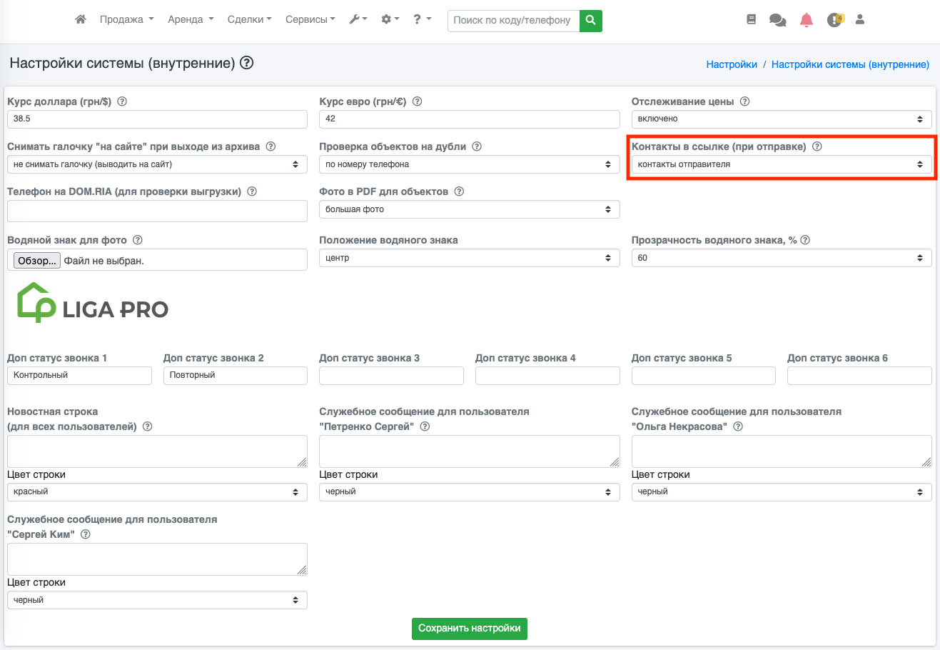 На сторінці, потрібно знайти такий параметр як «Контакти при відправці» (Рис. 1369). І тут є два параметри: контакти відправника (тоді при відправці посилання на сайт будуть висвітлюватися контакти того, хто відправив посилання) або контакти закріпленого ріелтора (тоді на відправці будуть вказуватися контакти ріелтора, який закріплений за об'єктом, посилання на який Ви відправляєте). Таким чином, Ви можете налаштовувати відображення контактів ріелтора при відправці.