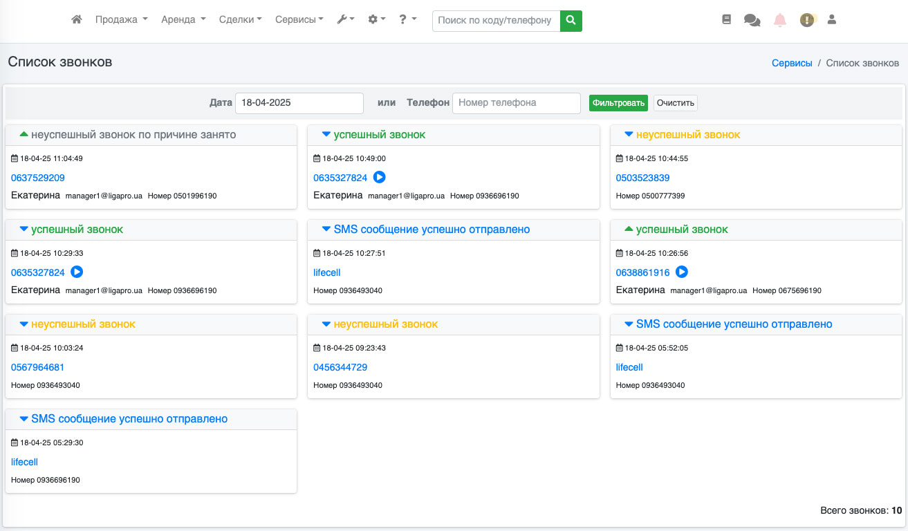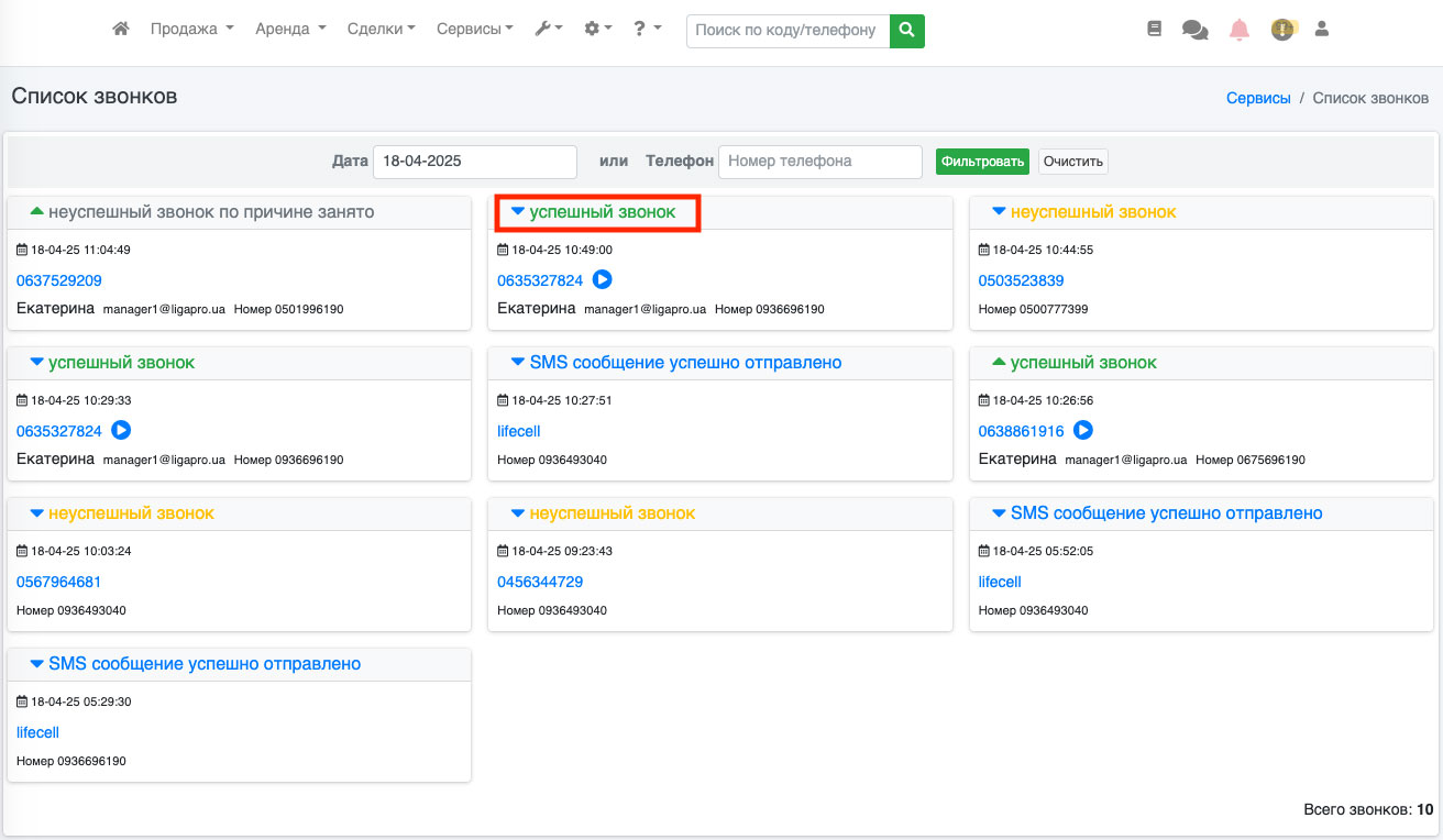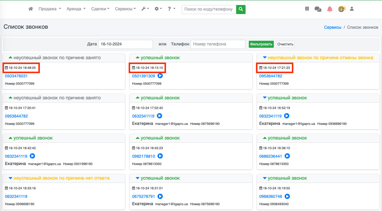 На открывшейся странице у Вас отобразится список звонков (Рис. 1394). Здесь Вы можете видеть все звонки на текущий день. Дополнительно указывается дата и время звонка, статус звонка (успешный/не успешный) на какой/с какого номера звонили и кто из менеджеров звонил.