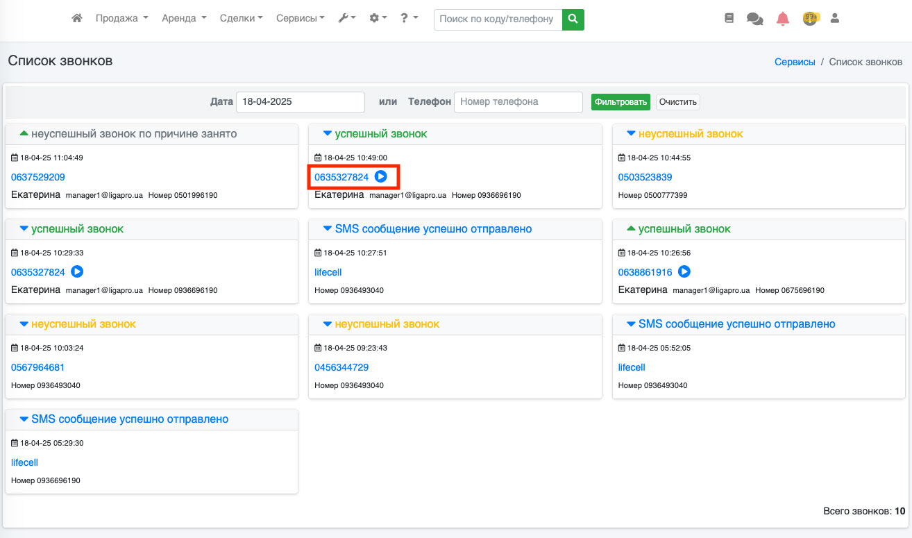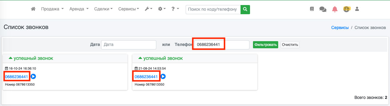 Для удобства Вы можете проводить поиск по номеру телефона. Просто вводите номер клиента и нажмите «Фильтровать». Система отобразит все звонки по этому номеру телефона (Рис. 1398).