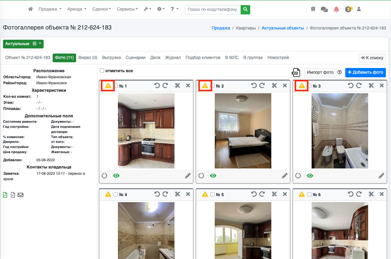 Чтобы посмотреть фото, которое нужно заменить - перейдите в фологалерею объекта (Рис. 1402, Рис. 1403). На открывшейся странице (Рис. 1404) возле фото с низким качеством будет отображатся иконка оранжевого цвета с восклицательным знаком. Просто удалите это фото и загрузите новое.