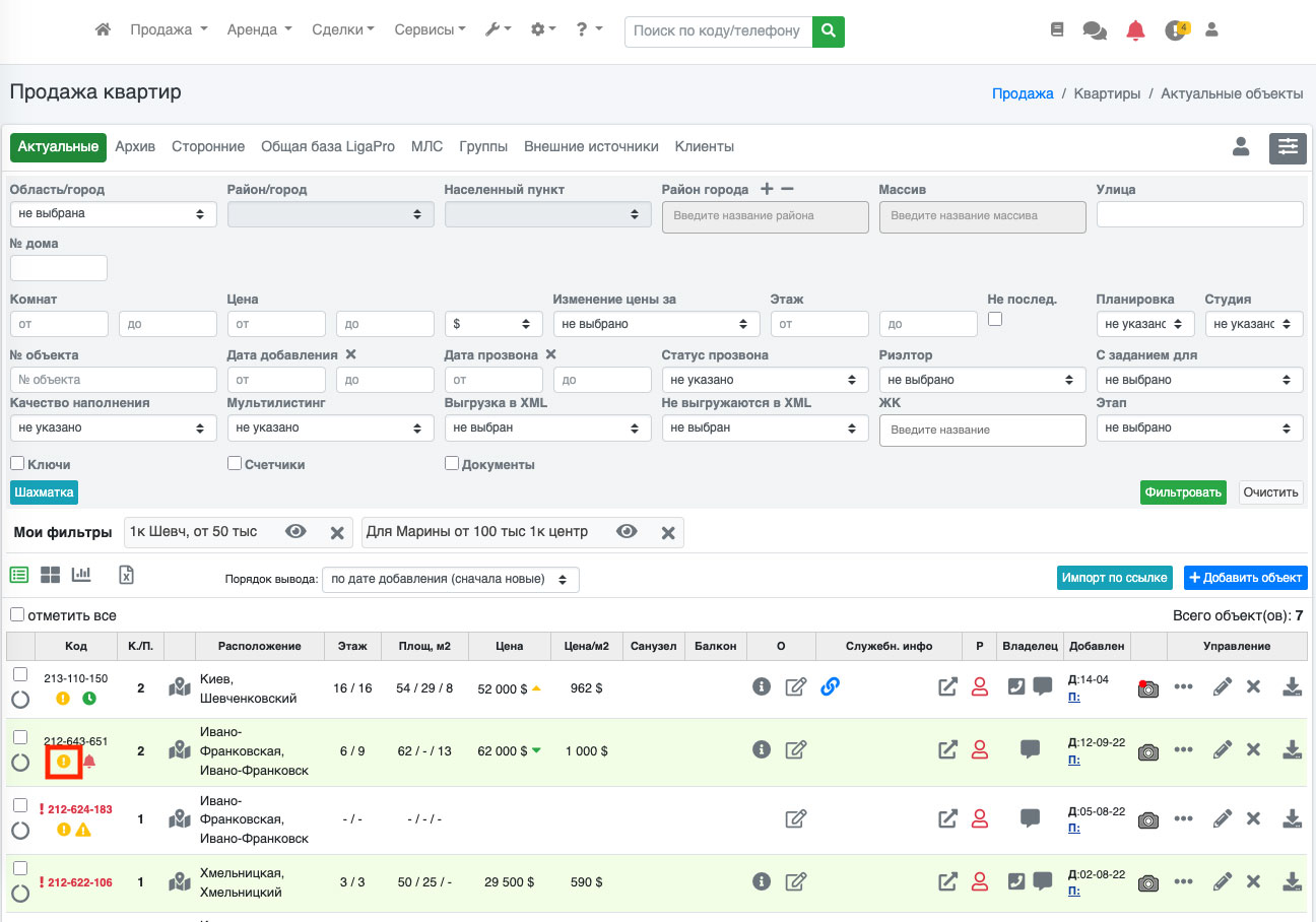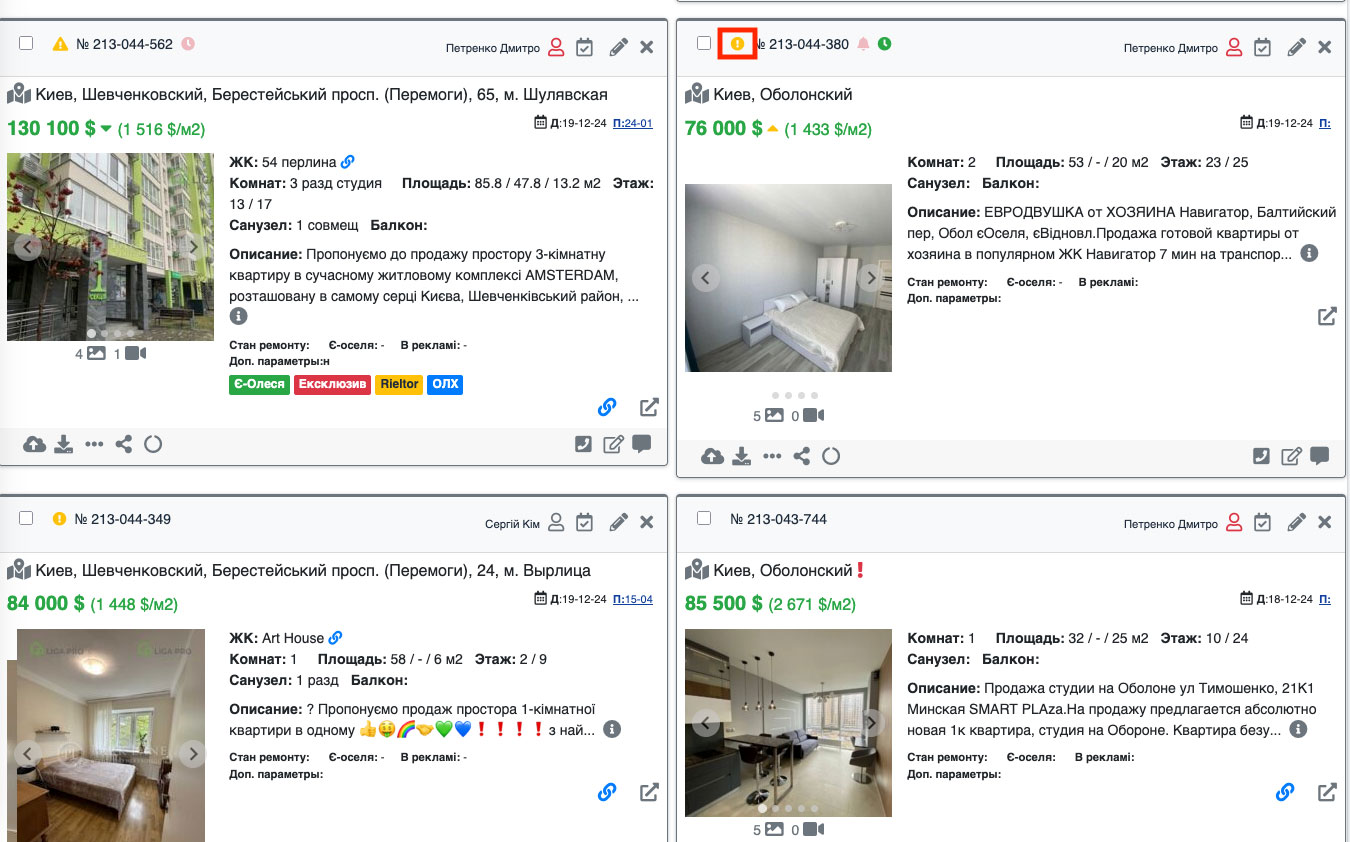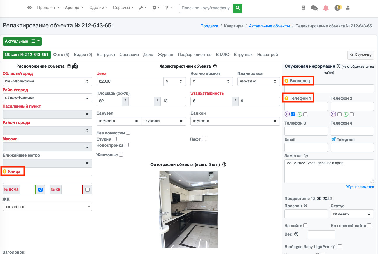 Возле таких объектов высвечивается соответствующая иконка (оранжевый кружок с восклицательным знаком) (Рис. 1405, Рис. 1406). Таким образом, Вы сразу можете определить в каком объекте фото нужно добавить необходимую информацию. В зависимости от рубрики набор параметров отличается. Например, для рубрики продажа квартир набор параметров следующий: улица, цена, площадь общая, этаж/этажность, владелец, телефон владельца, описание.
