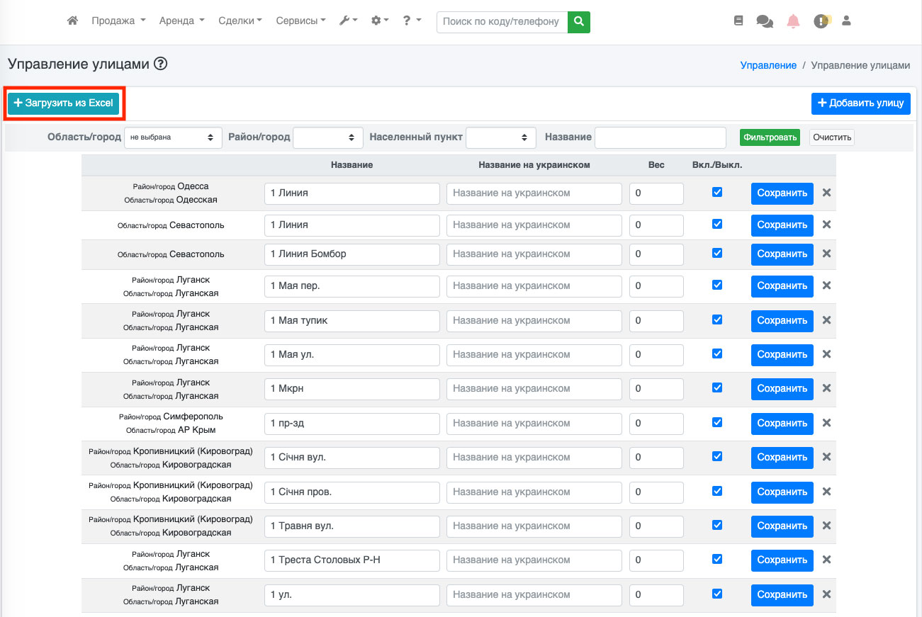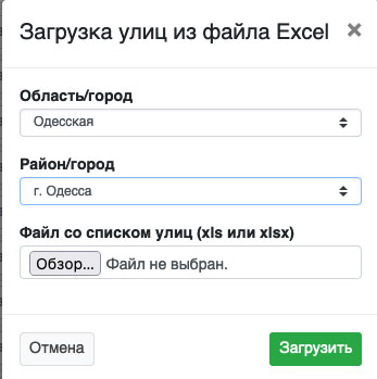 ВАЖЛИВО. У файлі, який Ви завантажуєте всі вулиці, повинні бути в одному стовпці «А». Тільки в цьому випадку система завантажить вулиці правильно.