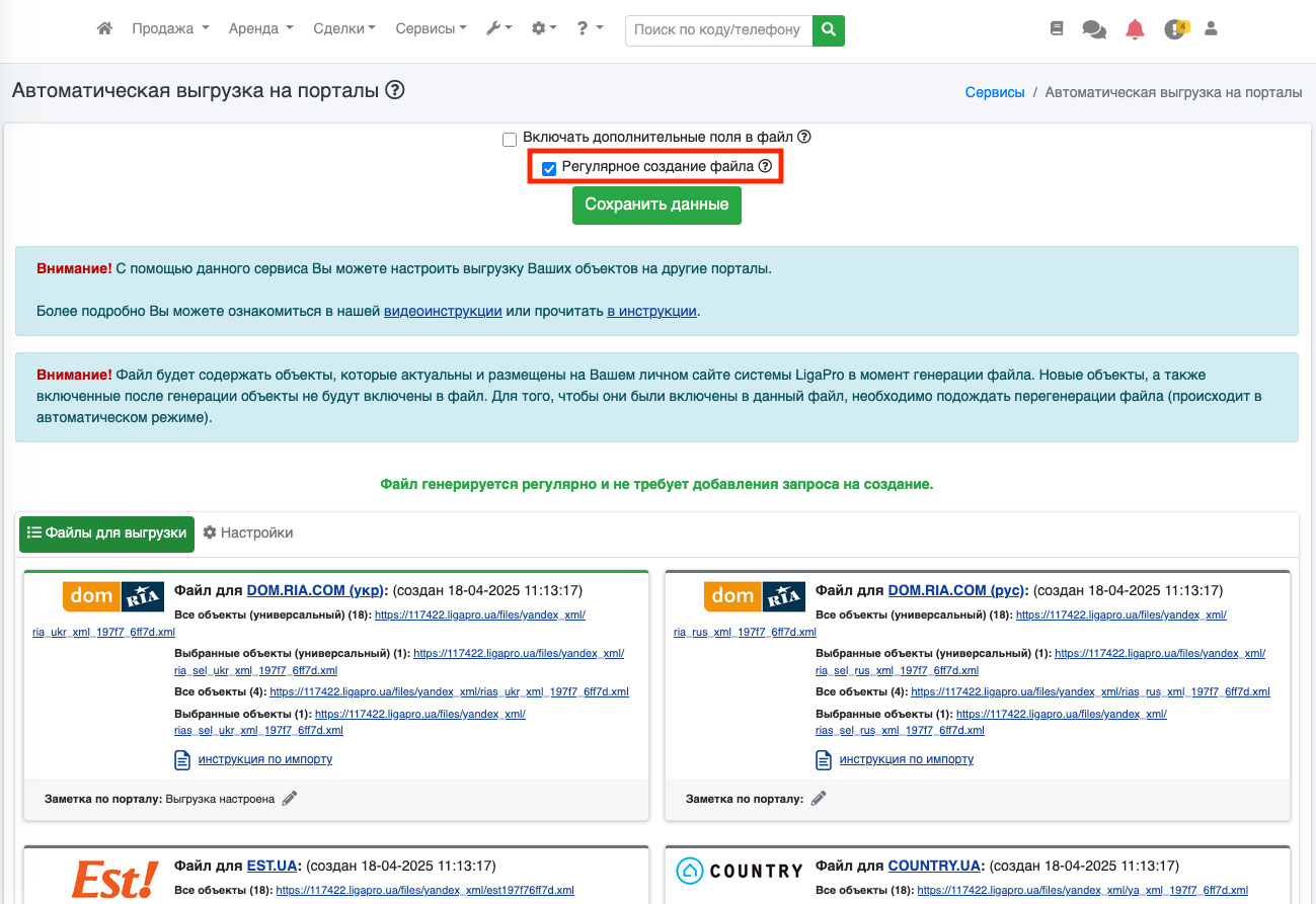 Если на открывшейся странице еще нет списка файлов, то поставьте галочку «Регулярное создание файла» и нажмите кнопку «Сохранить настройки». (Рис. 1451). В течении дня файлы будут сгенерированы.