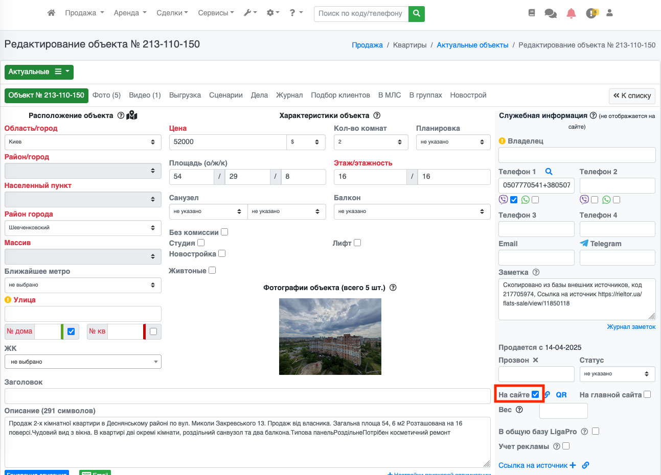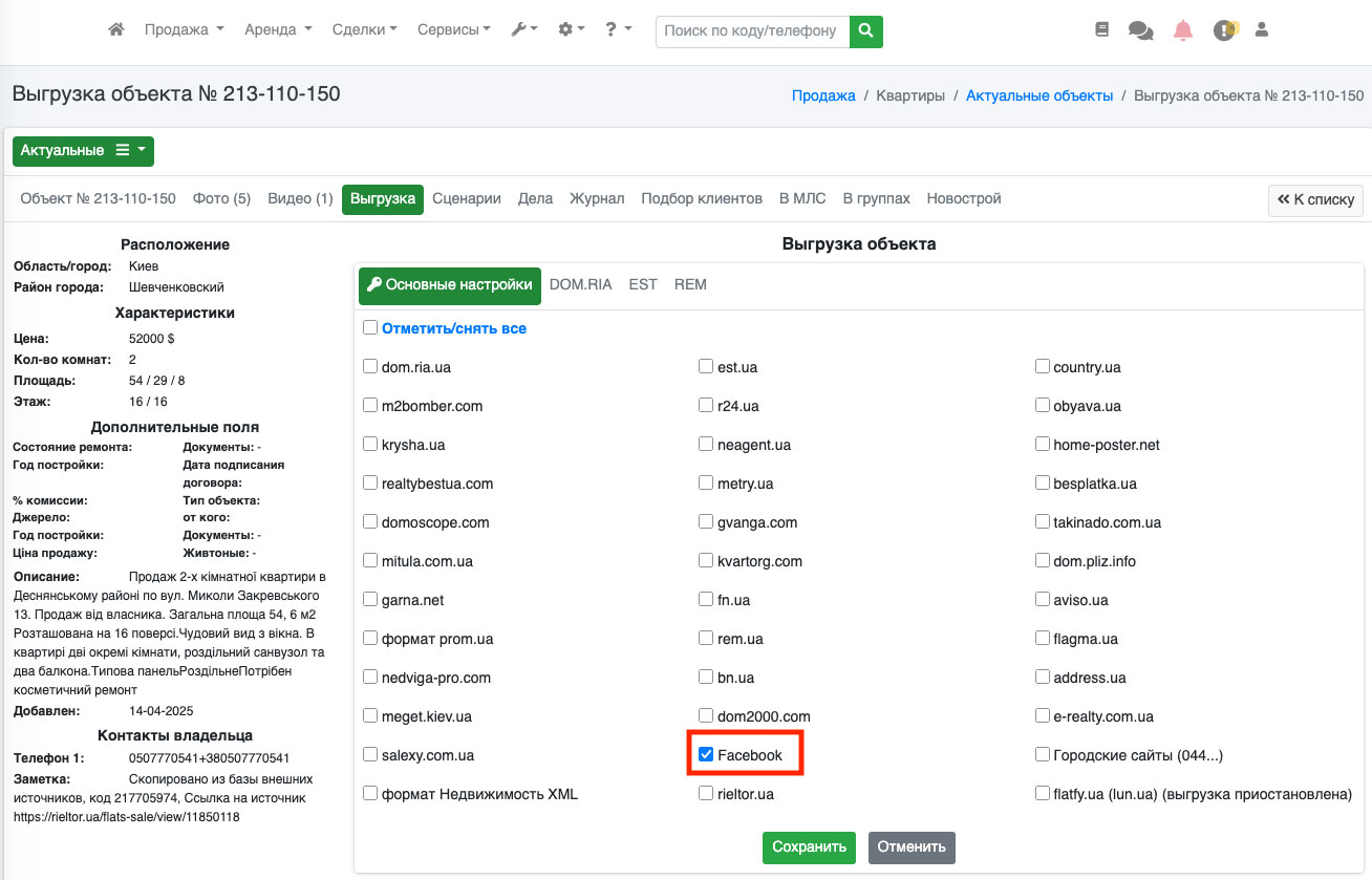 Если Вы отправили файл с выбранными объектами - дополнительно необходимо в редактировании объекта на вкладке «Выгрузка XML» поставить галочку напротив facebook и нажать кнопку «Сохранить». После этого объект попадает в файл с выбранными объектами (Рис. 1453).