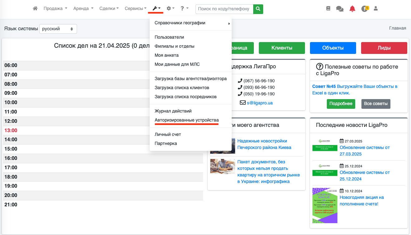В целях безопастности в ЦРМ системе ЛигаПро предусмотрена возможность просматривать на каких устройствах Вы авторизованы в CRM. Для этого перейдите в пункт «Управления – Авторизированные устройства» (Рис. 1524)