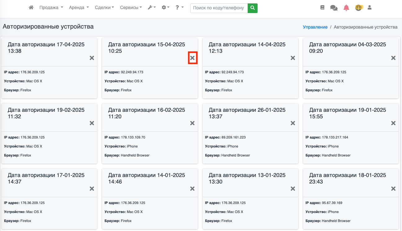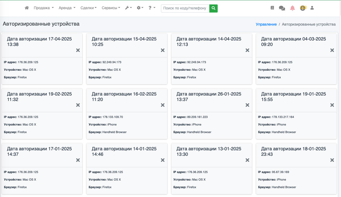 На открывшейся странице Вы увидите список устройств на которых Вы осуществили вход в црм систему (Рис. 1525).