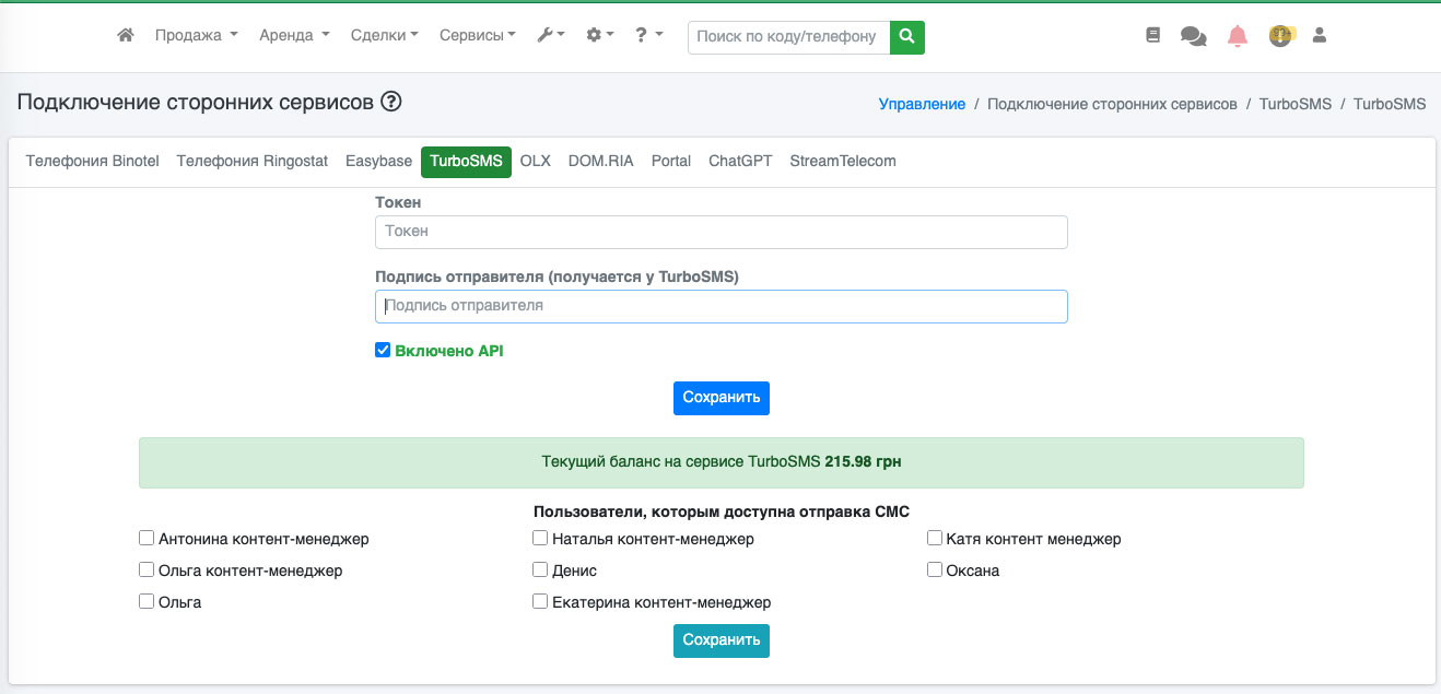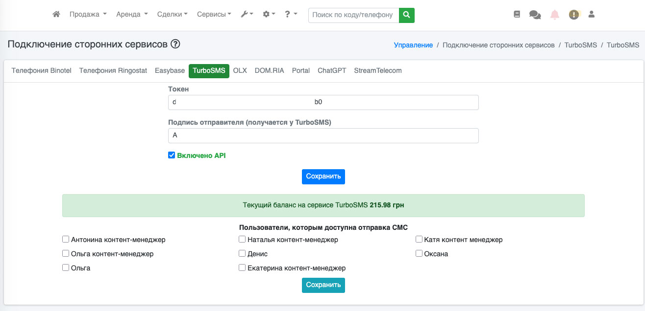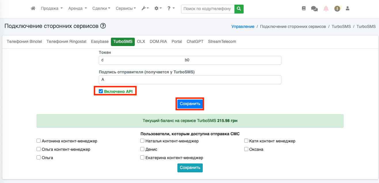 У нас відобразиться сторінка, на якій потрібно вказати Токен та Підпис відправника (ці дані Вам повинен надати сервіс TurboSMS). Поставити галочку «Увімкнено API» та натиснути кнопку «Зберегти» (Рис. 1510).