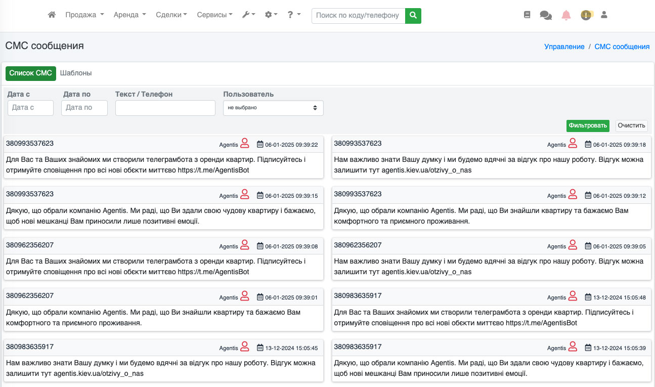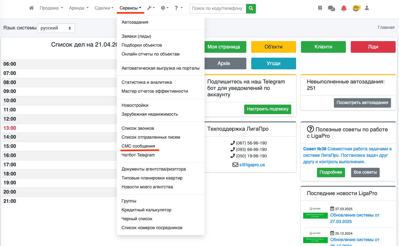У системі ЛігаПро для відправки смс безпосередньо з ЦРМ передбачена інтеграція з сервісом ТурбомСМС. Після підключення цього сервісу Ви зможете в один клік надсилати повідомлення своїм клієнтам та власникам, створювати готові смс шаблони для швидкої відправки, що дозволить покращити сервіс для Ваших клієнтів.