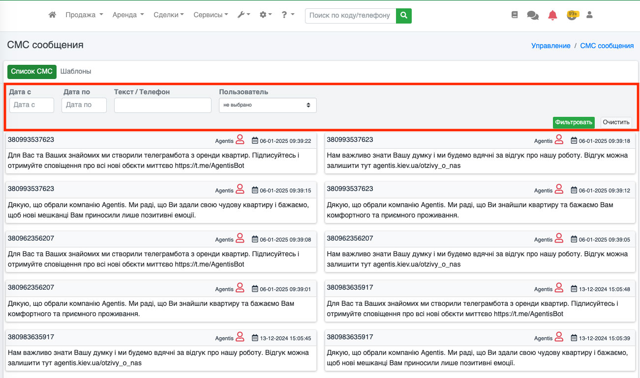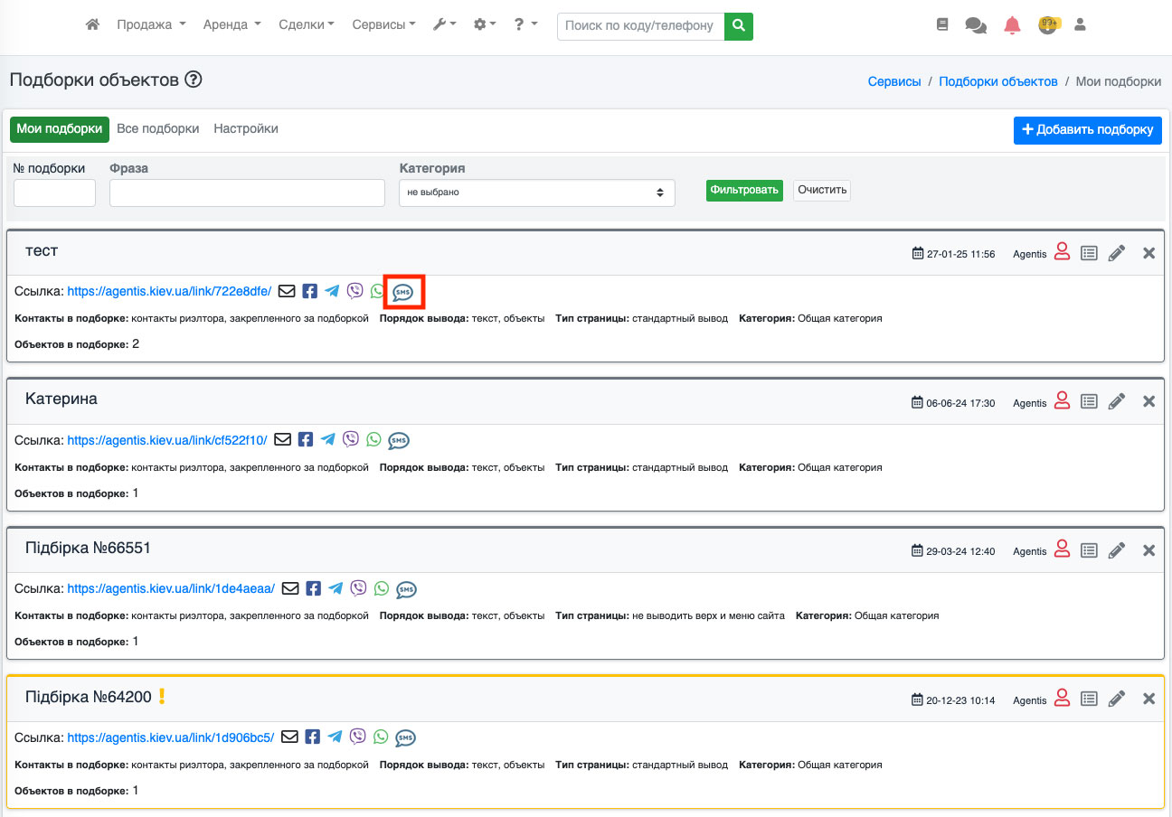 На сторінці, що відкрилася, навпроти кожної підбірки буде відображатися кнопку «SMS», натисніть на кнопку відправки смс біля потрібної підбірки (Рис. 1549).