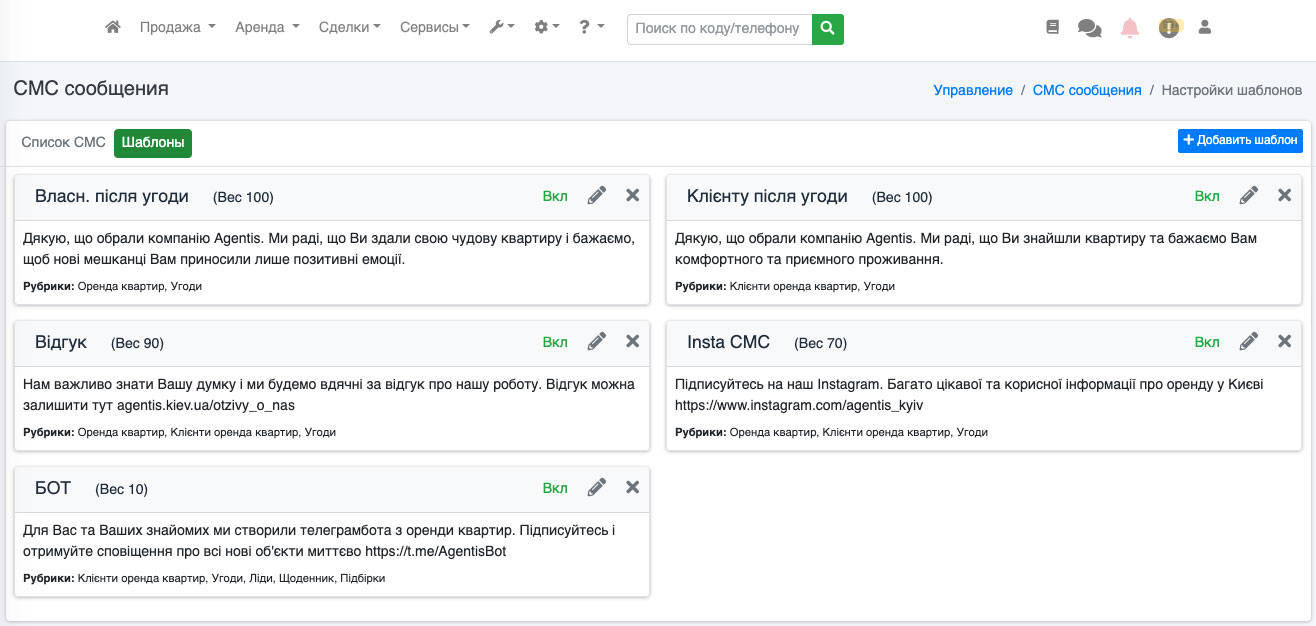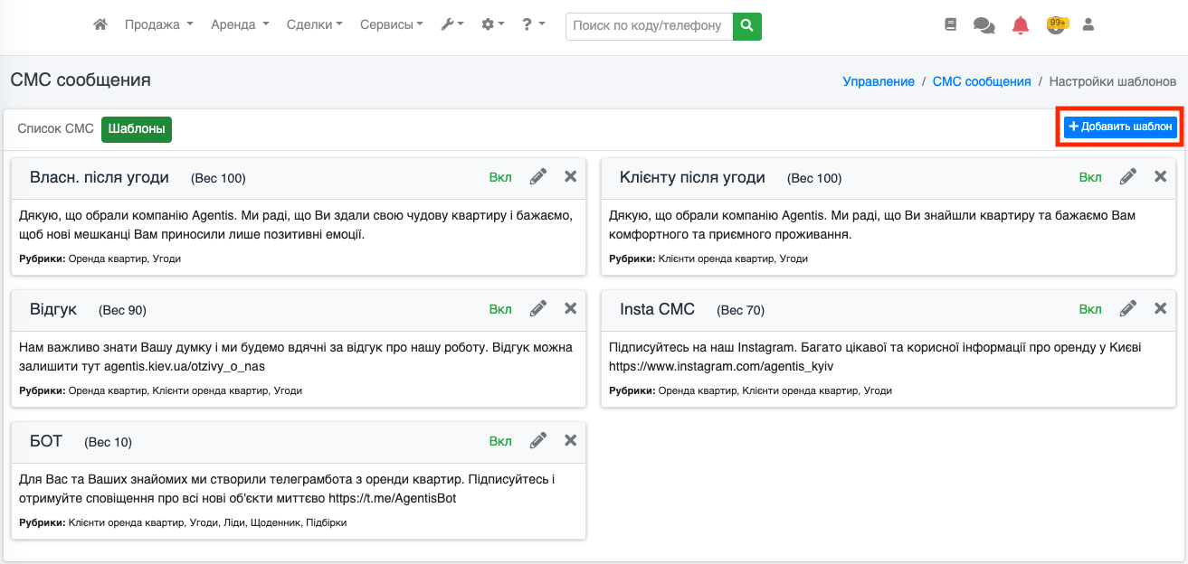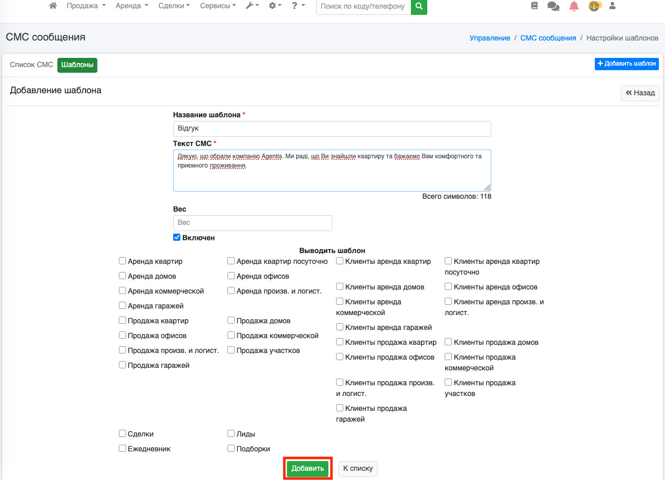 Відкриється вікно додавання шаблону. Тут потрібно вказати назву шаблону, Ви можете додати текст СМС, вказати вагу для сортування (у списку шаблонів), а також вказати, де цей шаблон буде доступний для відправки. Це можуть бути об'єкти (усі рубрики), клієнти (усі рубрики), угоди, заявки/ліди, добірки, щоденники. Після того, як Ви все вказали, потрібно натиснути на кнопку «Додати» (Рис. 1519).
