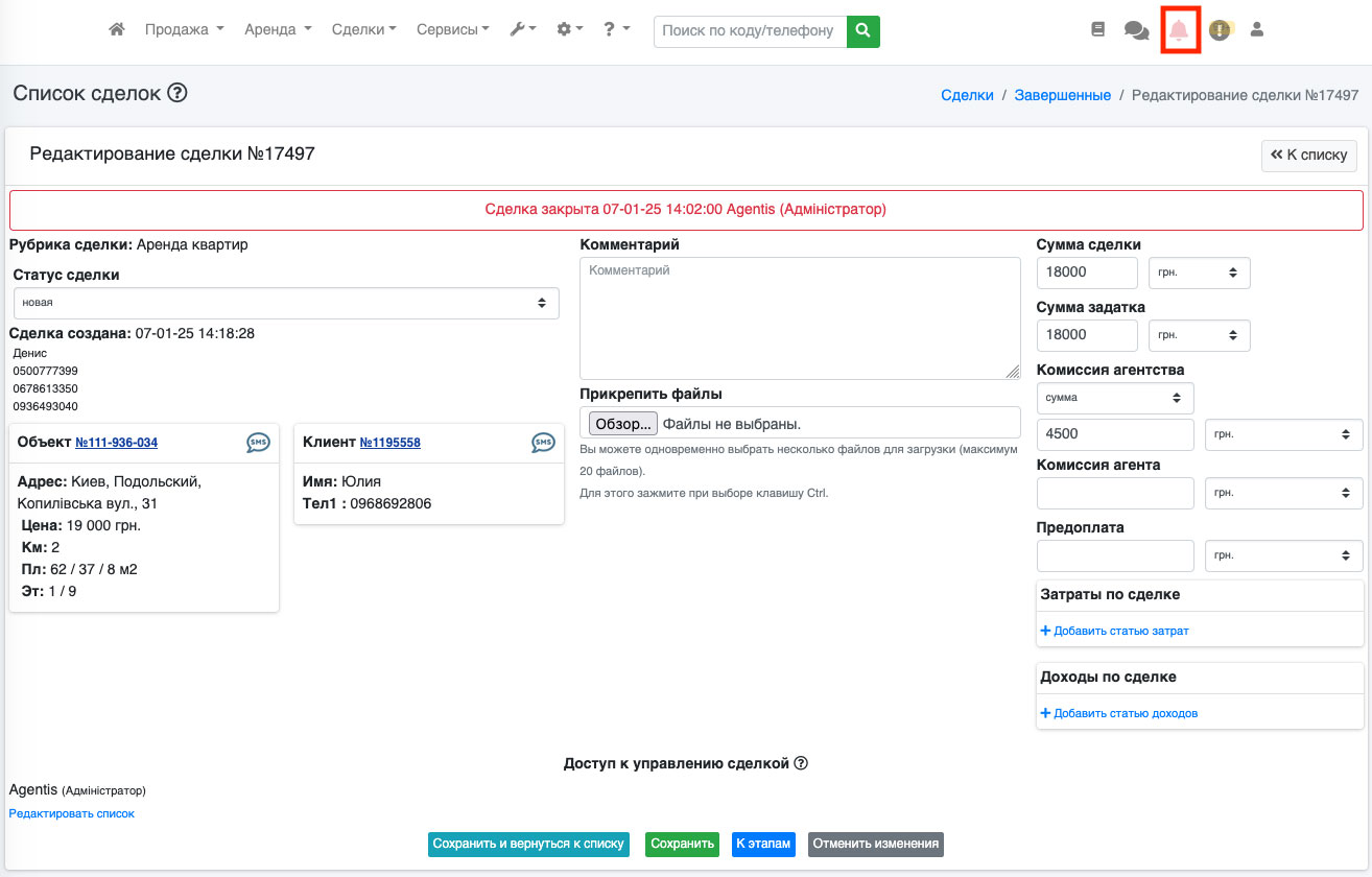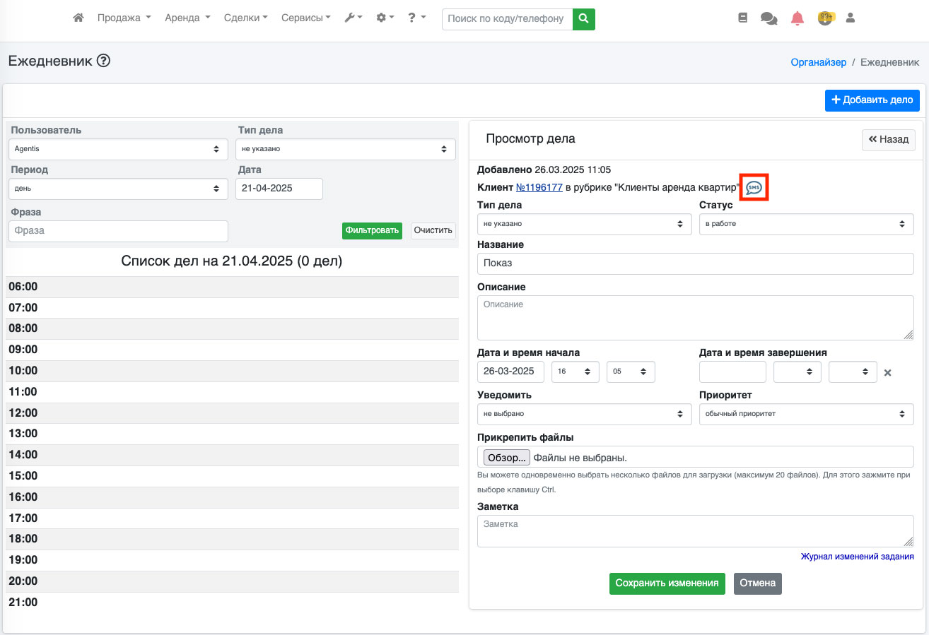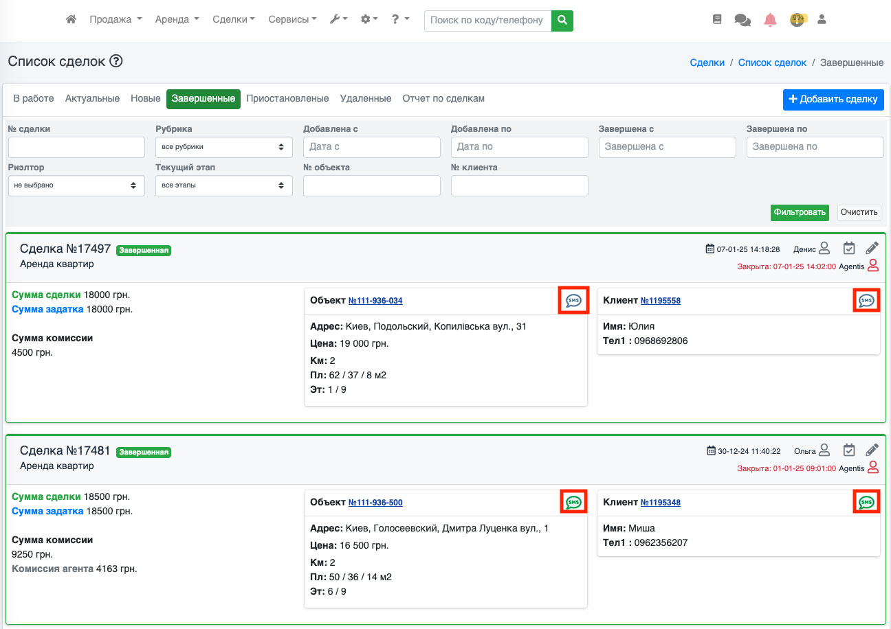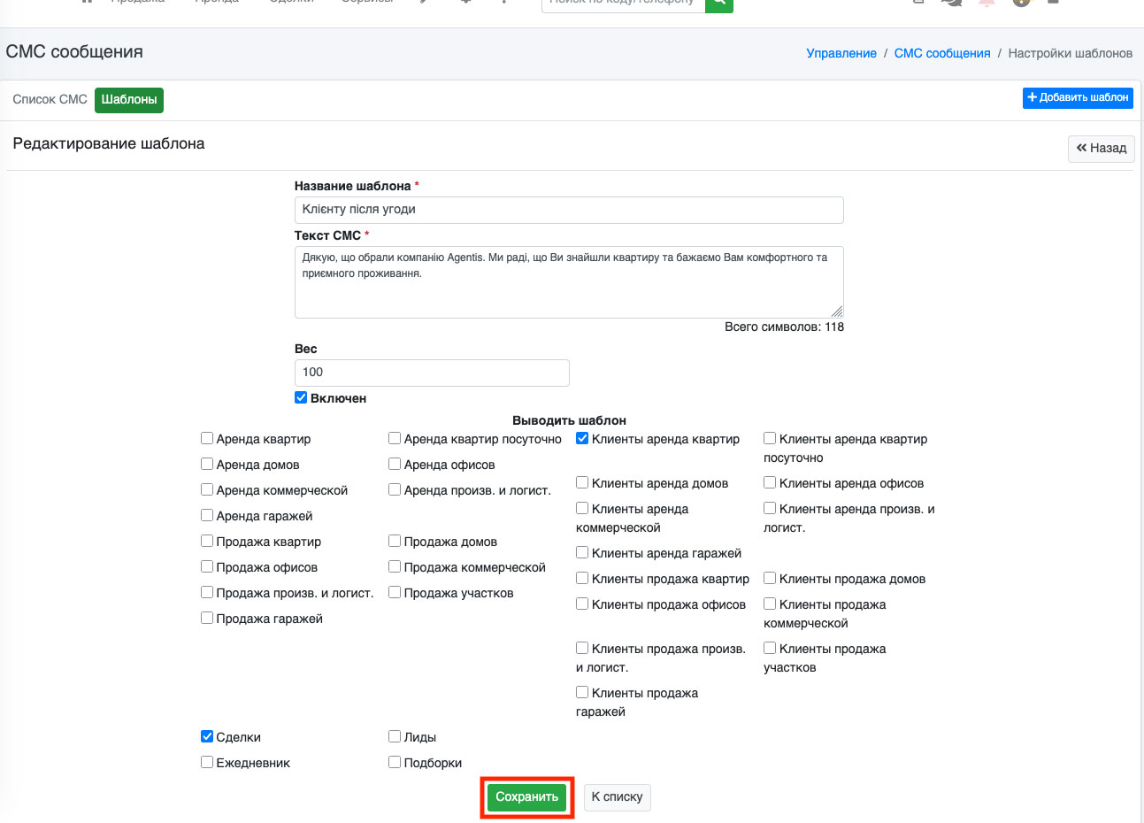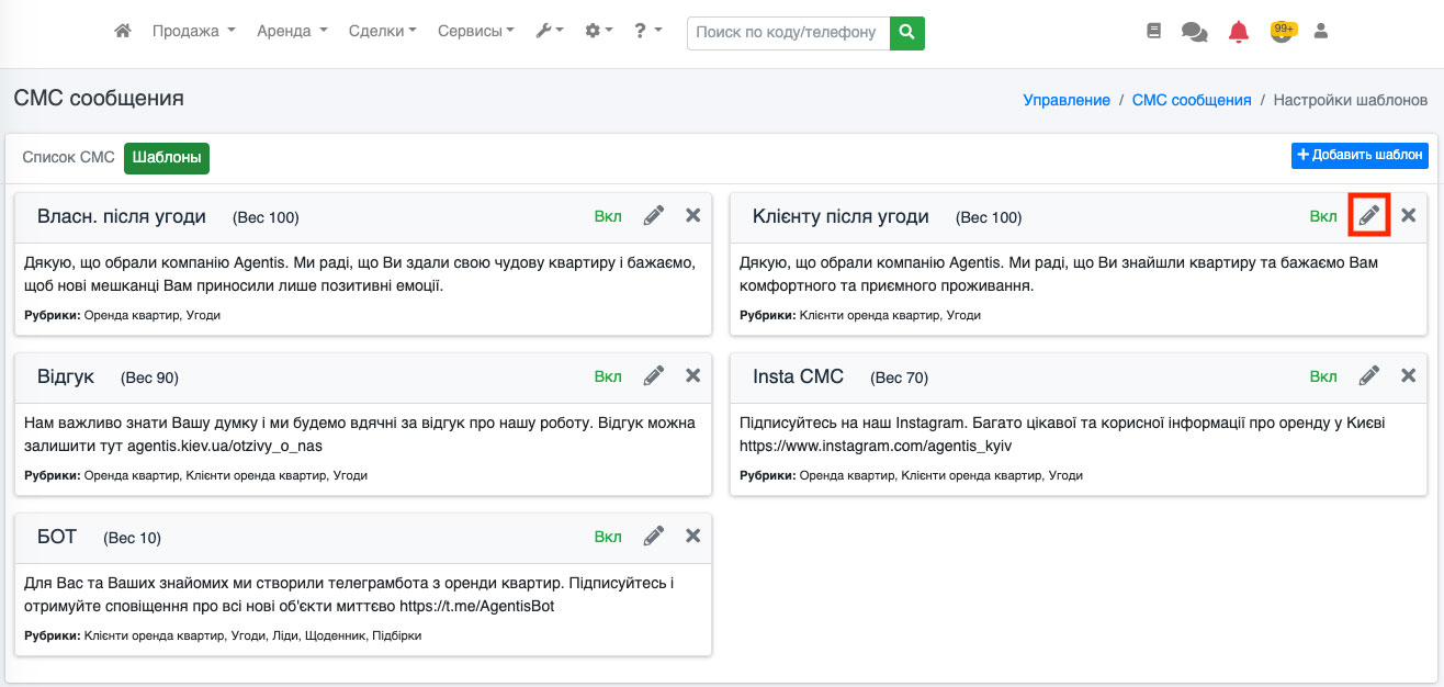 Також кнопка «SMS» доступна і в редагуванні угоди. Для цього перейдіть до редагування угоди (Рис. 1558).