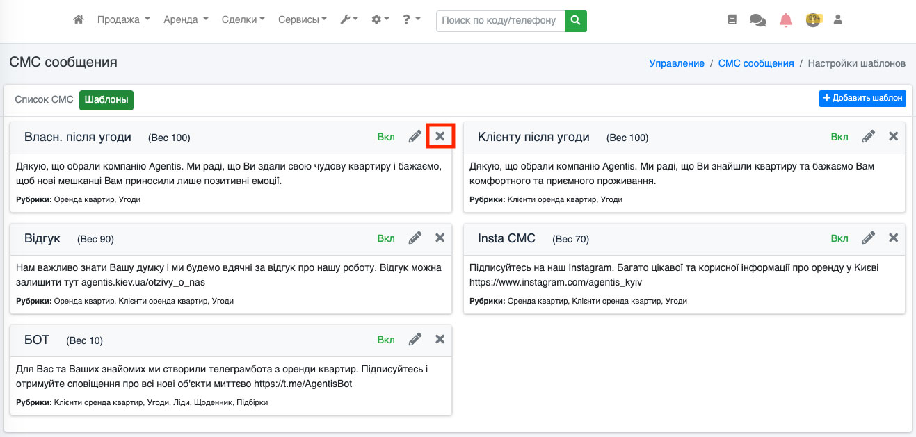 Ви можете у будь-який момент видалити шаблон. Для цього у списку шаблонів біля потрібного шаблону натисніть на іконку «червоний хрестик» (Рис. 1522).