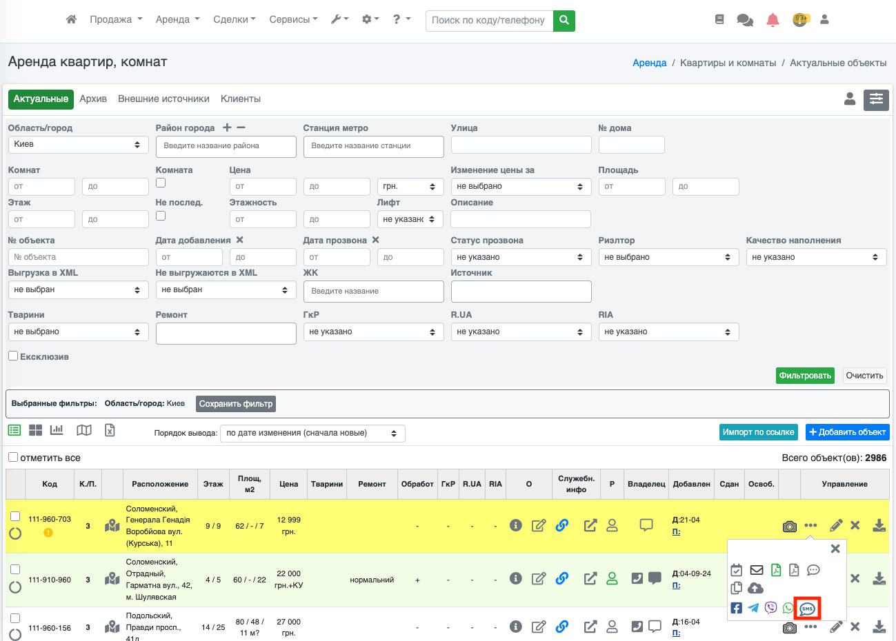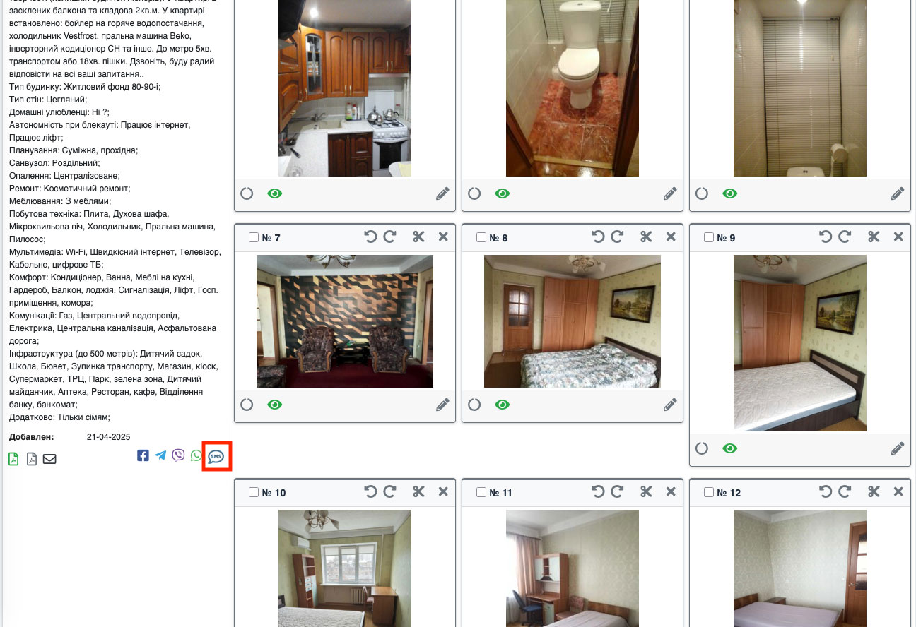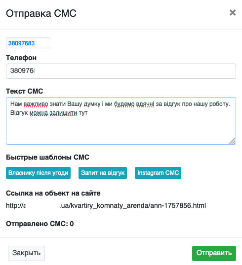 На сторінці, що відкрилася, біля коду об'єкта буде кнопка «SMS» (Рис. 1559), натиснувши на яку Ви зможете теж відправляти смс повідомлення.