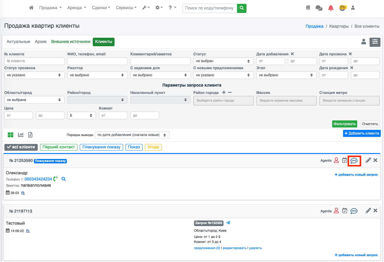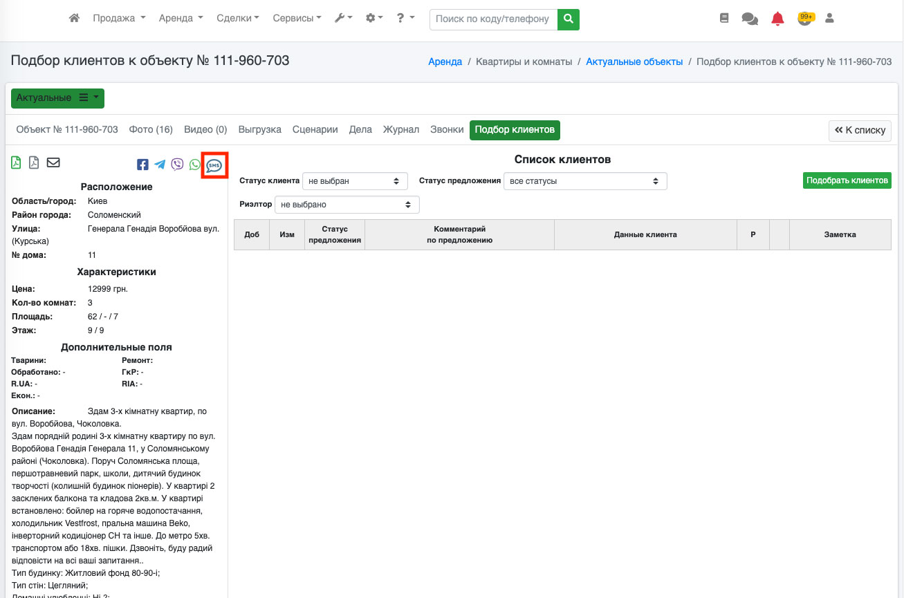 Перейдіть до списку клієнтів і знайдіть іконку SMS (Рис. 1535).