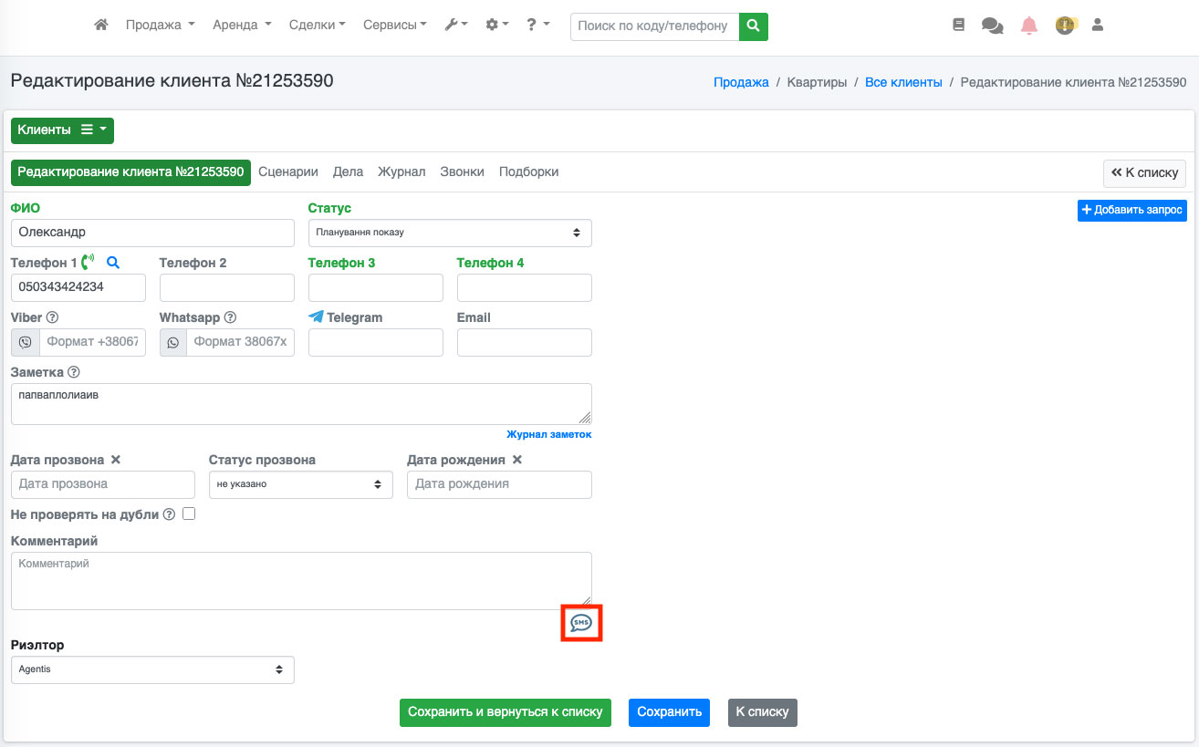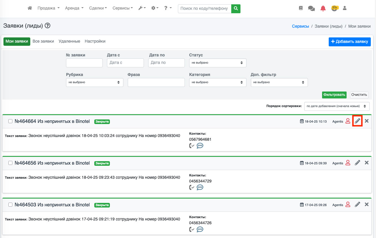 Також кнопка «SMS» доступна і в картці заявки/ліда. Для цього перейдіть до редагування заявки/ліда (Рис. 1546).