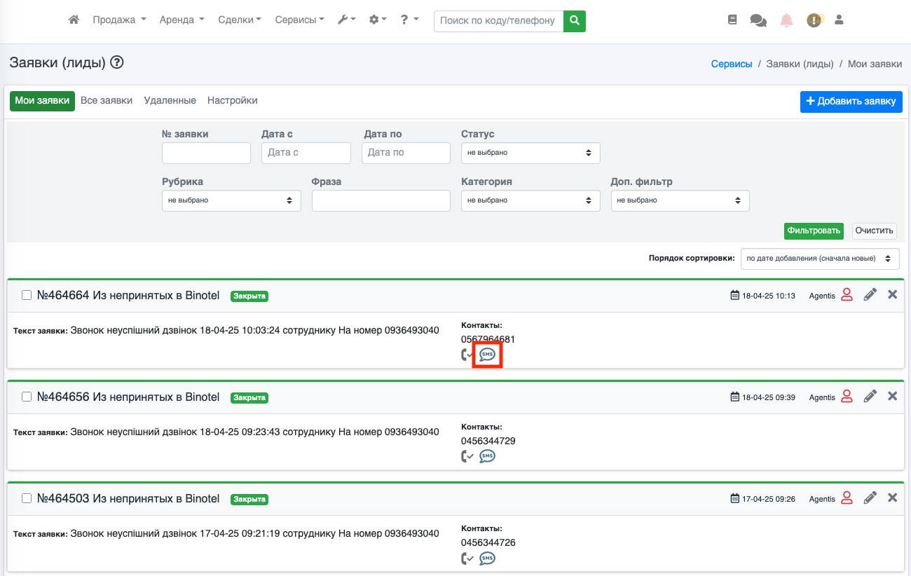 На сторінці, що відкрилася, навпроти кожної заявки буде відображатися кнопку «SMS», натисніть на кнопку відправки смс біля потрібної заявки/ліда (Рис. 1543).