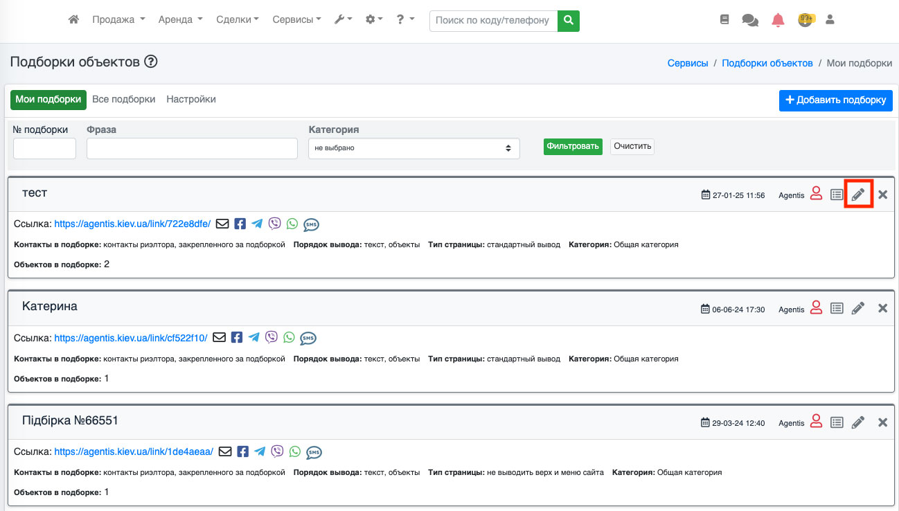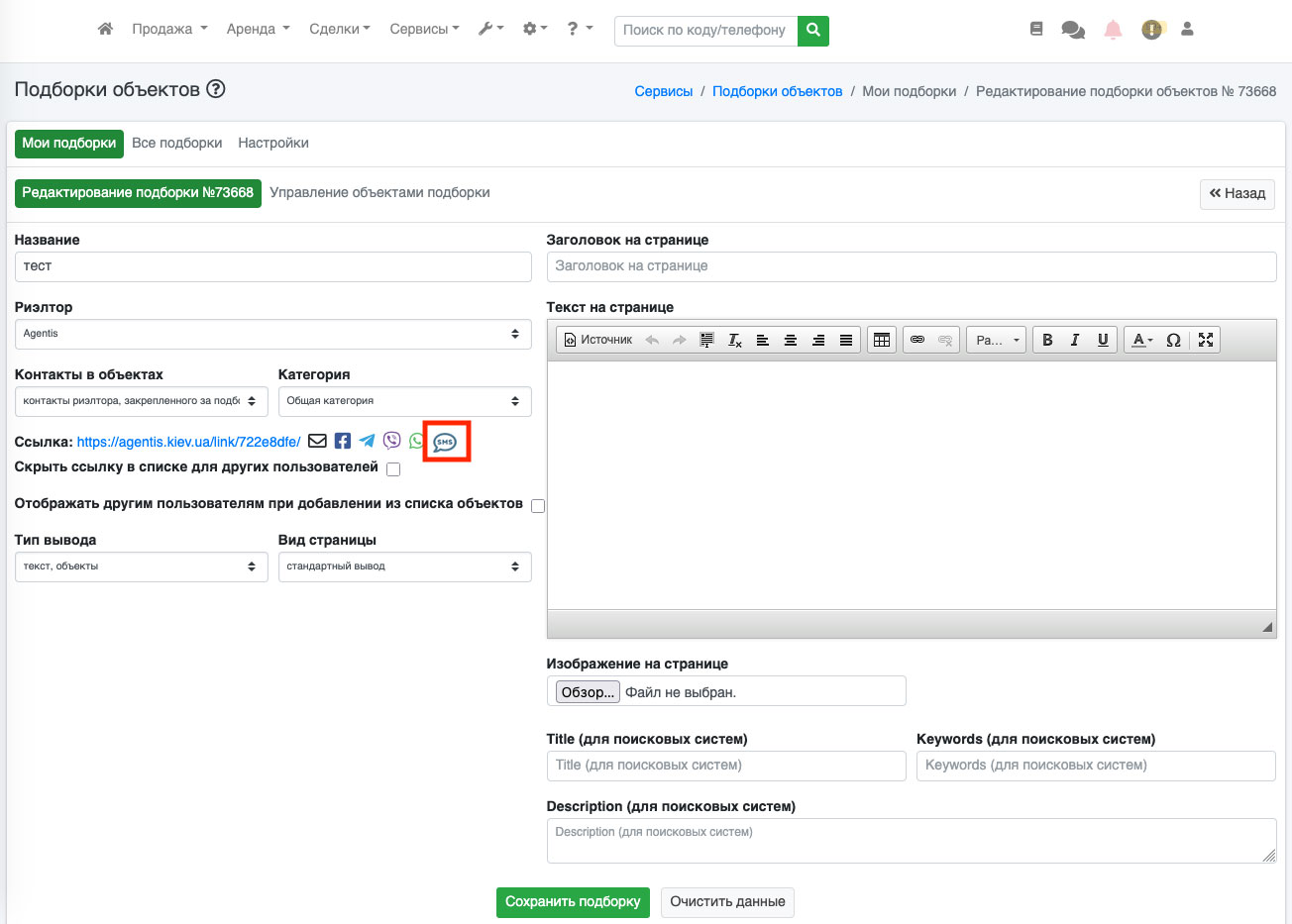 Також кнопка «SMS» доступна і для редагування підбірки. Для цього перейдіть до редагування підбірки (Рис. 1552).