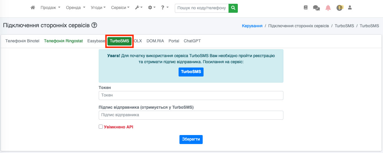 Для початку роботи з смс необхідно підключити сервіс ТуброСМС. Для цього необхідно перейти до пункту «Параметри – Підключення сторонніх сервісів» (Рис. 1508).