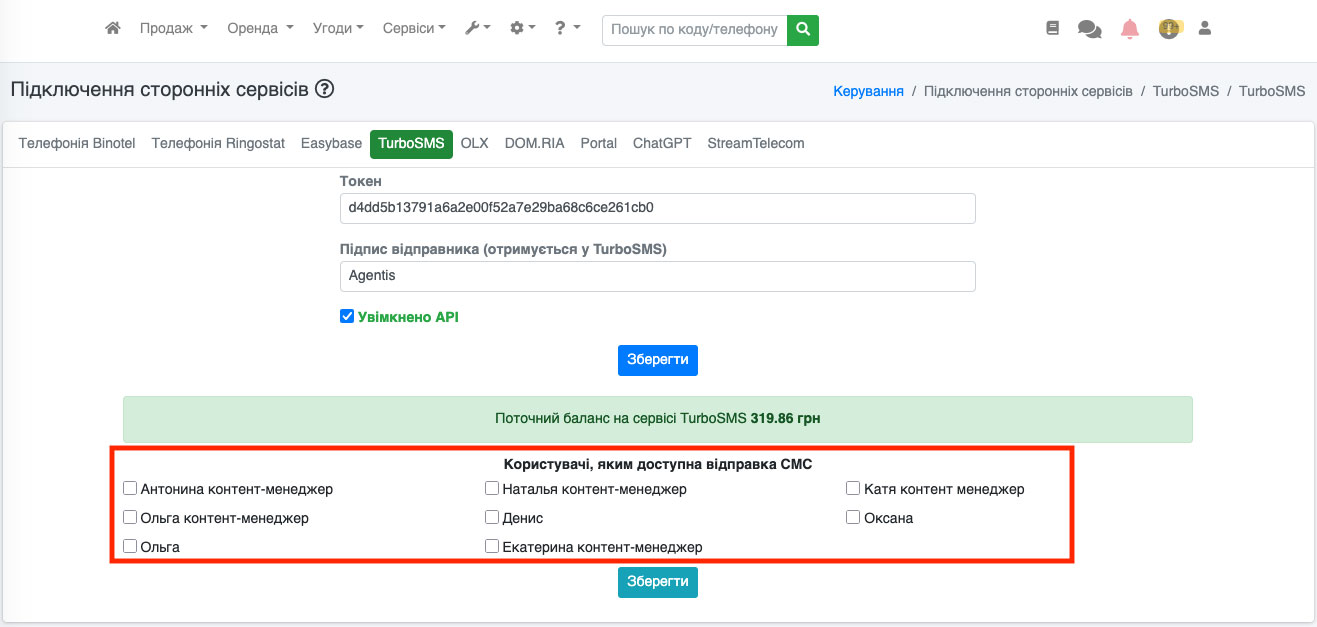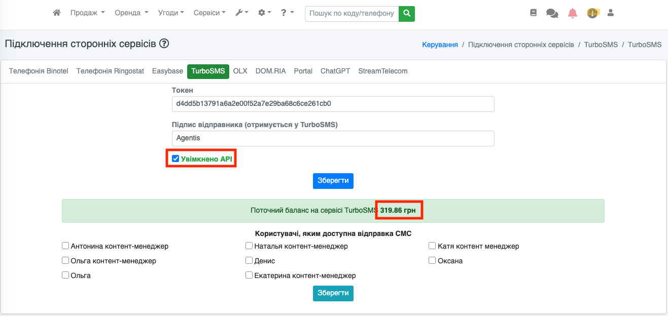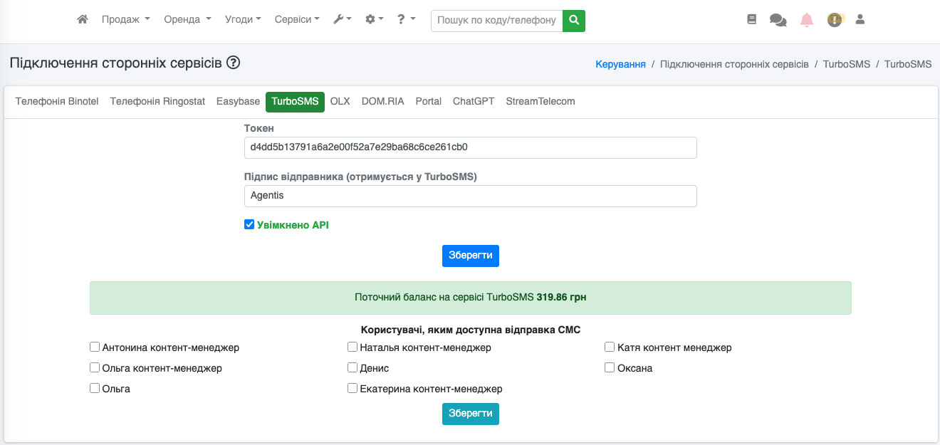 У нас відобразиться сторінка, на якій потрібно вказати Токен та Підпис відправника (ці дані Вам повинен надати сервіс TurboSMS). Поставити галочку «Увімкнено API» та натиснути кнопку «Зберегти» (Рис. 1510).