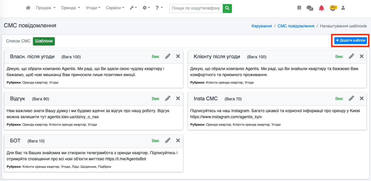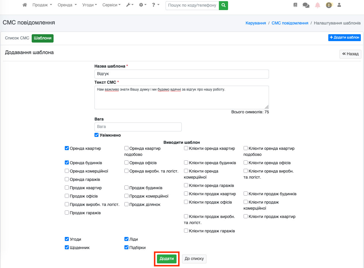 Відкриється вікно додавання шаблону. Тут потрібно вказати назву шаблону, Ви можете додати текст СМС, вказати вагу для сортування (у списку шаблонів), а також вказати, де цей шаблон буде доступний для відправки. Це можуть бути об'єкти (усі рубрики), клієнти (усі рубрики), угоди, заявки/ліди, добірки, щоденники. Після того, як Ви все вказали, потрібно натиснути на кнопку «Додати» (Рис. 1519).